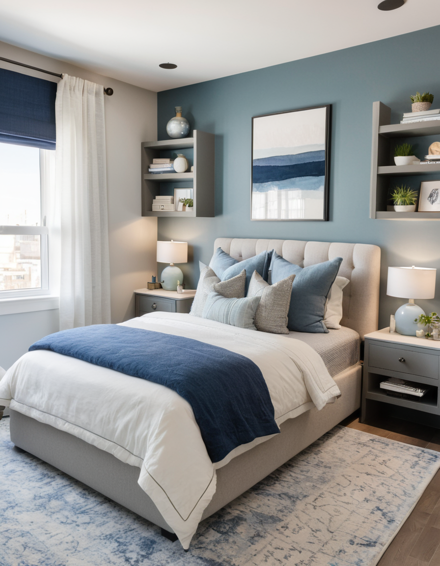Make the room cozy by hanging up the warm and inviting atmosphere you want in your small apartment bedroom with soft textures and layered bedding. Select a soft area rug, a cozy upholstered headboard, and some pillows and throws in matching colors for a cozy and inviting bedroom. The above the headboards space is usually underused or left vacant so make the best use of it adding a storage bench or a family picture. Select the color schemes, such as light blues, earth tones, pastel tones, etc. in place so that they become bright, calming colors. Additionally, introduce the storage functionality, such as single-bed drawers, or a wardrobe to store the room, neat, and functional.