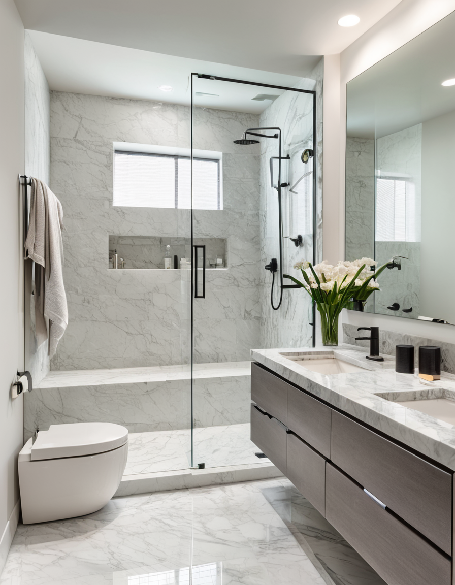 A modern bathroom design in an apartment features straight lines, modern fixtures, and a simple method. Top up the room with fancy materials like marble, glass, and chrome to impress while using minimal space. Also, choose the frameless glass door, a floating vanity storage with undersink in-class, and a large mirror to achieve the illusion of a larger space. Keep the layout plain with whites, grays, and blacks and add a bit of sophistication with minimalistic decorations such as a bud vase or a smart soap dispenser. This design is the best for creating the spa-like atmosphere in the bathroom of your apartment.
