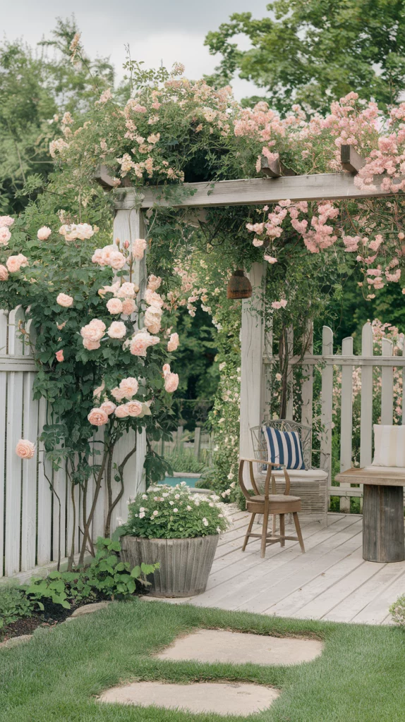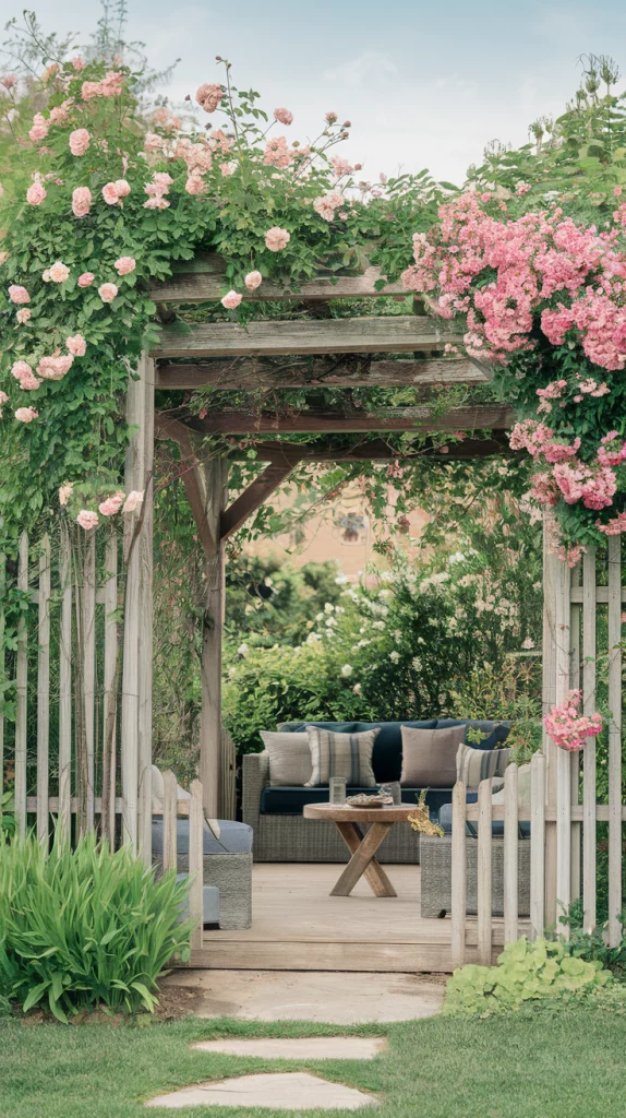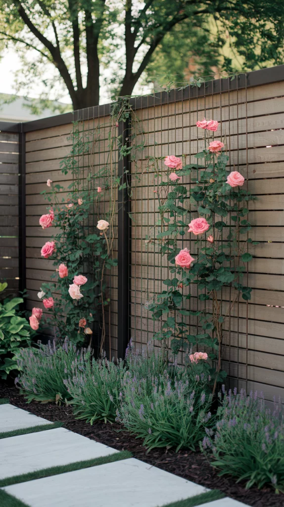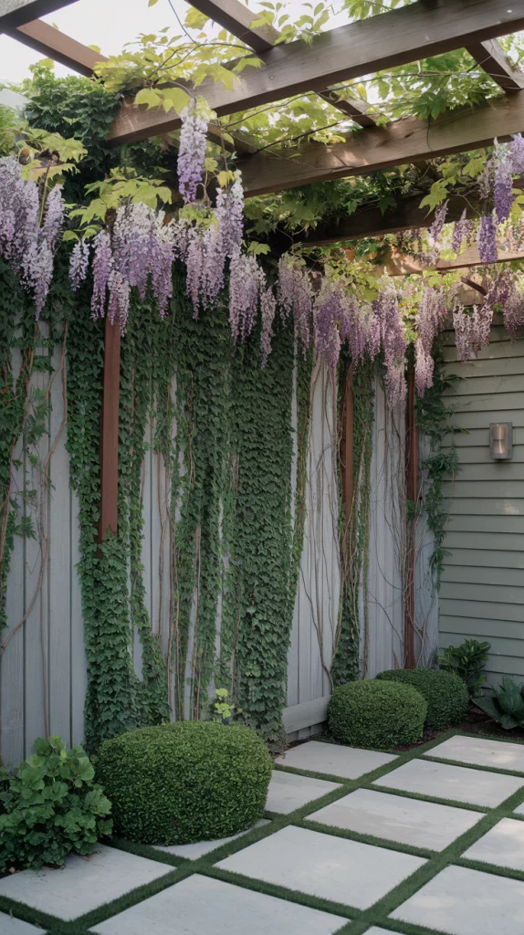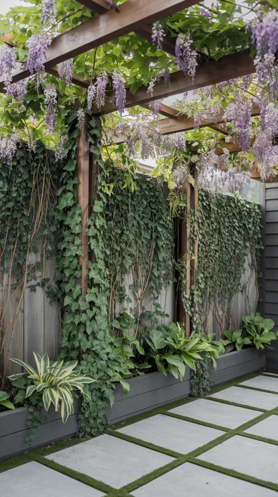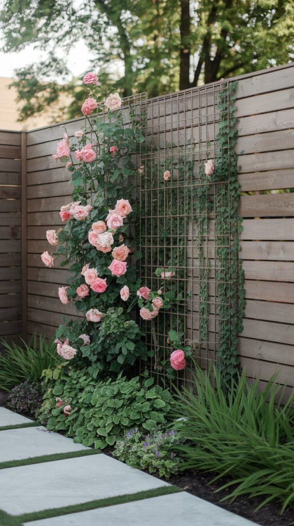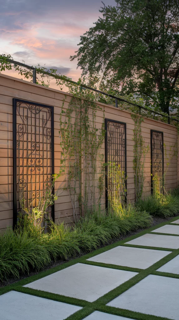 Climbing plants like ivy, clematis, and wisteria add texture and color, turning an ordinary fence into a living work of art. Metal or wooden trellises can help guide their growth, creating a lush, cascading effect. Choose fast-growing climbers for quick coverage or flowering vines for seasonal interest.