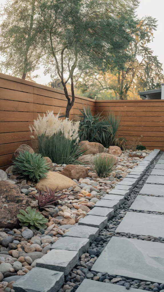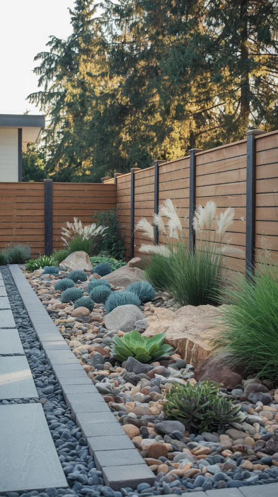 Incorporating rock gardens and stone borders into fence landscaping adds texture, durability, and an organic feel to your yard. Arrange river rocks, pebbles, or large stones along the fence to create a natural boundary. Drought-resistant succulents, ornamental grasses, and creeping ground covers thrive in rock gardens, requiring minimal maintenance while delivering year-round beauty.