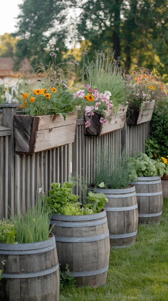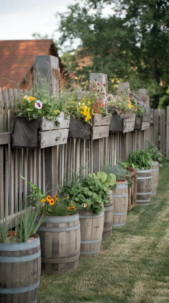 For a rustic aesthetic, mount wooden planters directly onto the fence or use barrel-style containers along the base. Choose weathered wood or reclaimed materials for a charming, farmhouse-inspired feel. Fill them with wildflowers, herbs, or cascading ivy to soften the fence’s structure while maintaining a natural look.