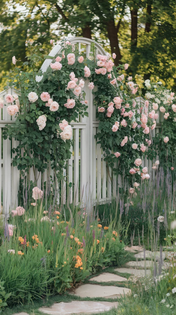 Metal and wire frames provide stability and structure for climbing plants, making them ideal for fence landscaping. Choose stainless steel wire grids, wrought iron panels, or decorative metal trellises to guide the growth of roses, jasmine, or clematis. These structures add architectural interest and create a more defined, polished appearance.