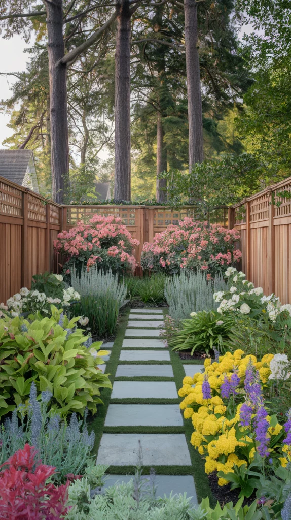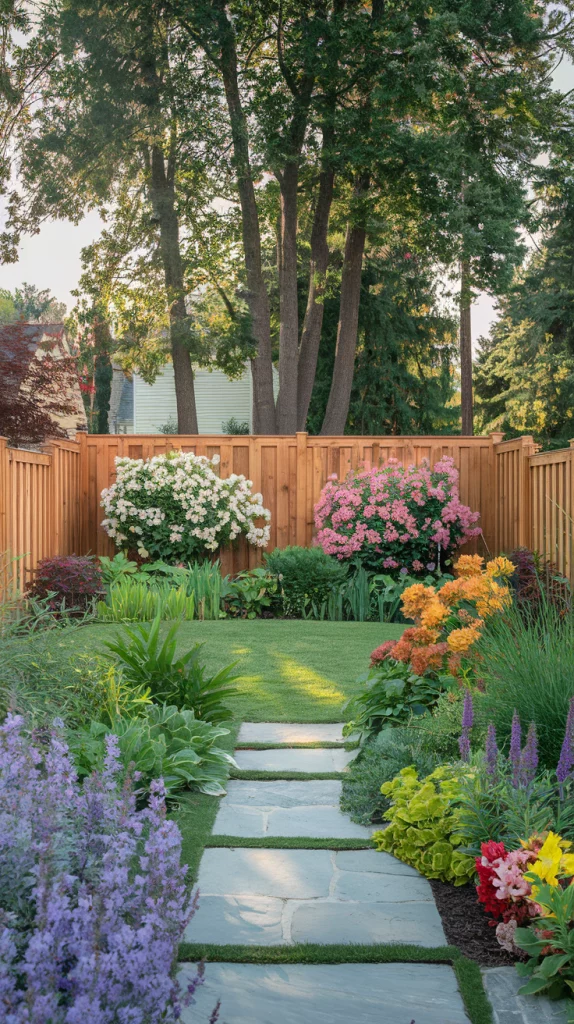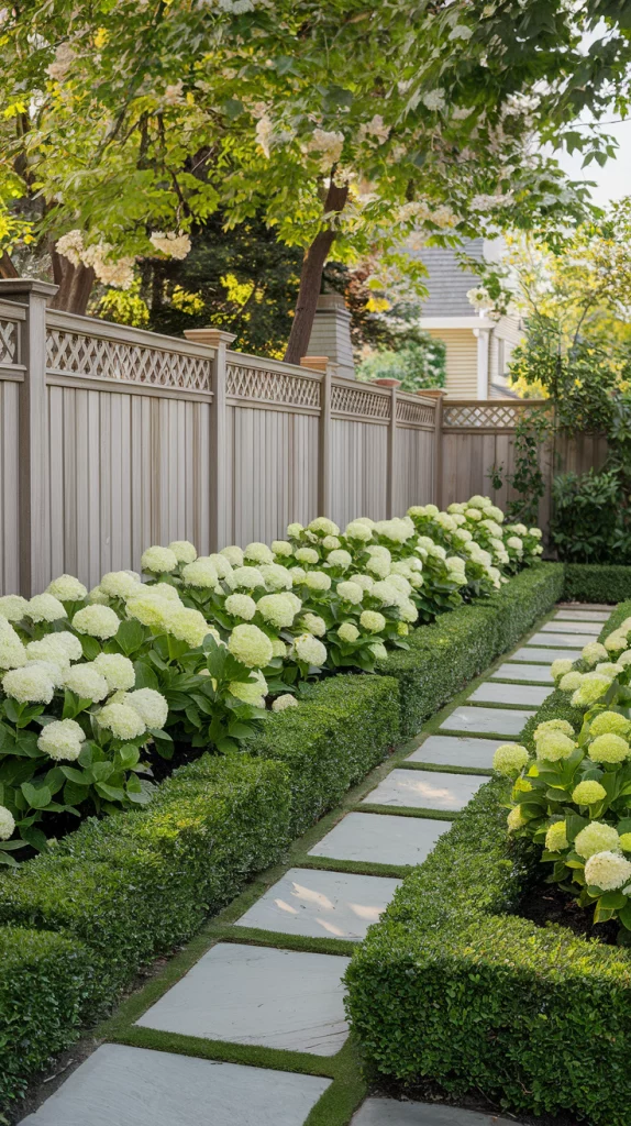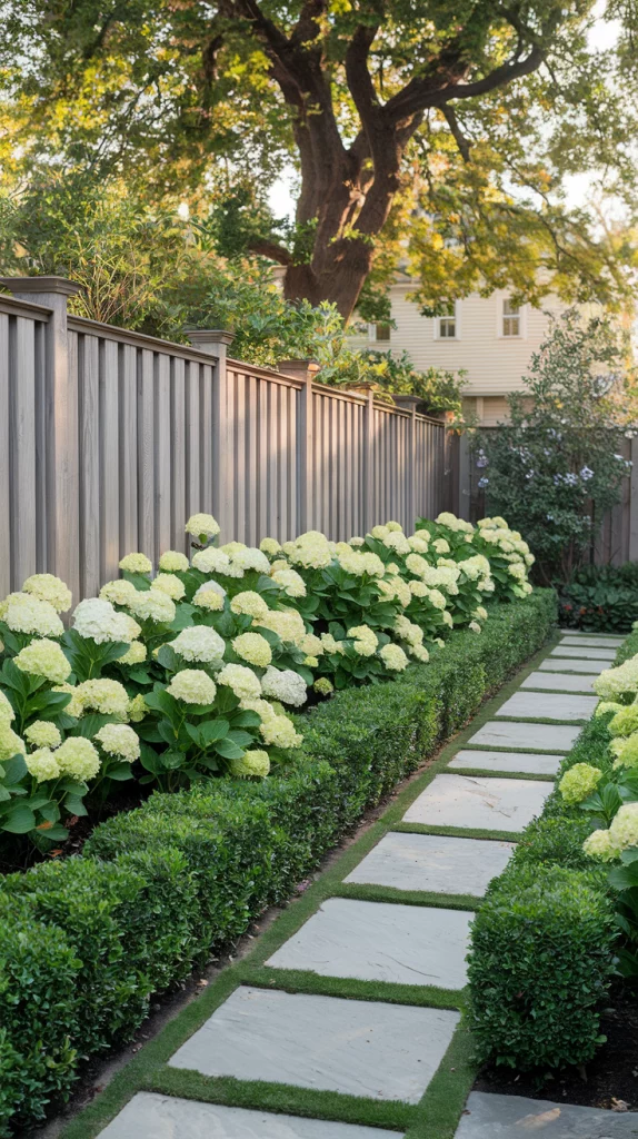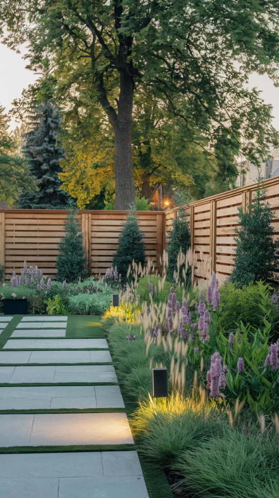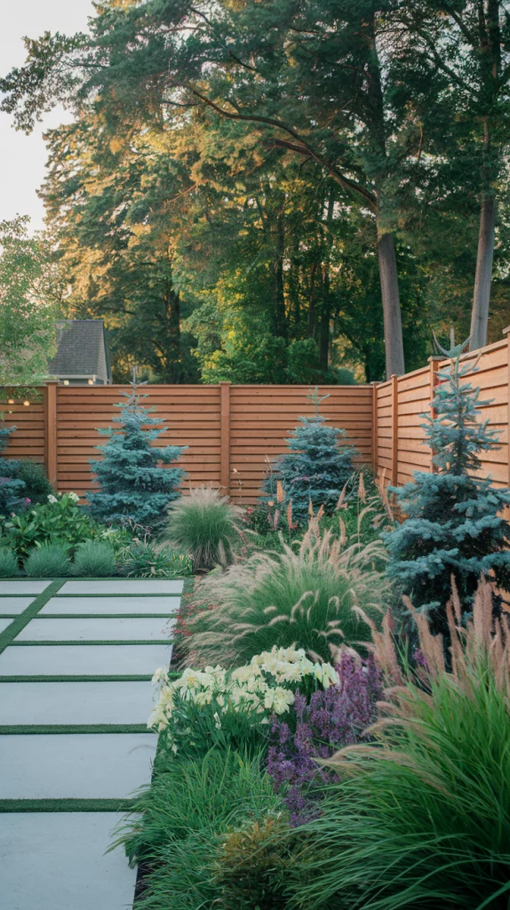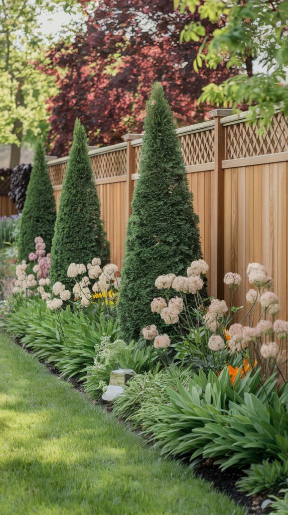 Combine trees, shrubs, and perennials in layers to create a visually striking fence landscape. Start with tall trees at the back, mid-sized bushes in the middle, and colorful flowers at the front. This method provides depth, variety, and year-round beauty.