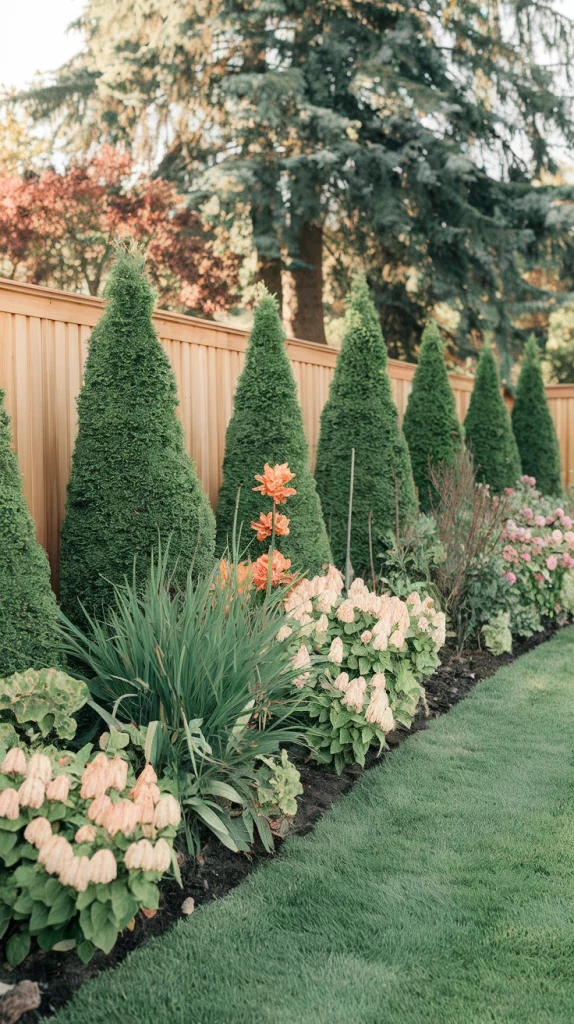 A mix of evergreens and seasonal plants ensures your backyard fence landscaping looks vibrant in all seasons. Evergreens like boxwood, juniper, or arborvitae provide structure, while seasonal blooms like tulips, dahlias, or chrysanthemums add changing colors throughout the year. Layering both types creates a dynamic and balanced aesthetic.