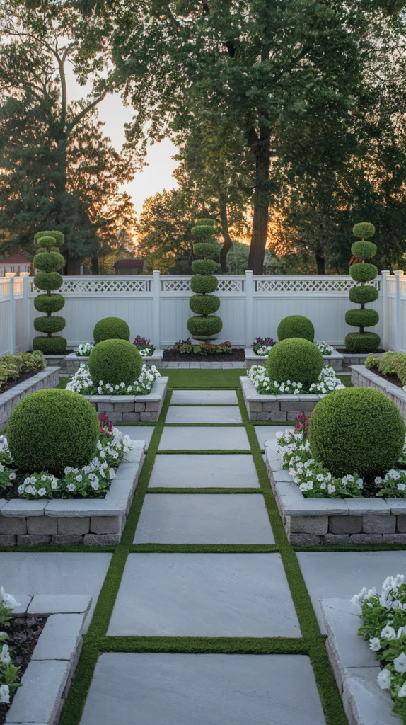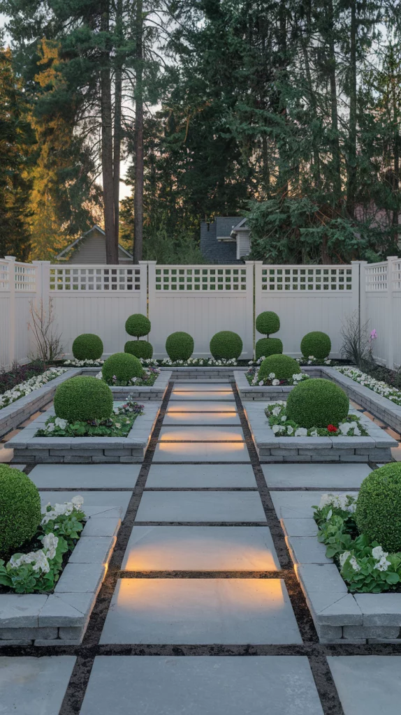 For a structured, balanced aesthetic, opt for symmetrical landscaping along your backyard fence. Plant identical shrubs, flowers, or ornamental grasses on both sides to create a mirrored effect. This design style works well with boxwood hedges, stone borders, and geometric layouts, offering a polished and formal appeal.