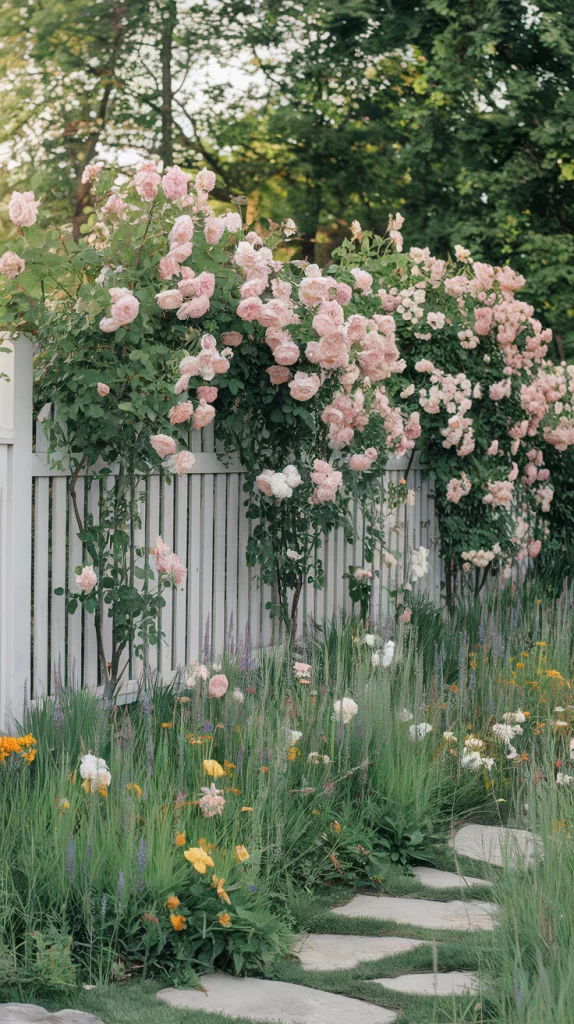 A cottage-style fence garden is effortlessly romantic and full of natural charm. Plant a mix of wildflowers like daisies, lavender, poppies, and hollyhocks along the fence for a whimsical, free-flowing aesthetic. This approach requires minimal upkeep while attracting pollinators like butterflies and bees.