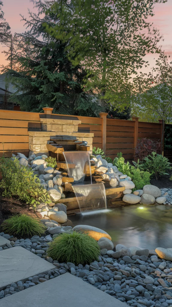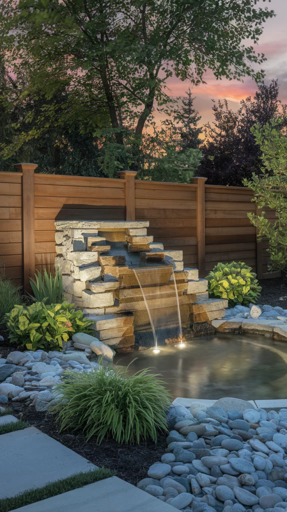 Adding a water feature near your fence landscape introduces movement and a soothing ambiance to your backyard. Consider small fountains, cascading waterfalls, or a narrow reflecting pool along the fence line. The sound of running water creates a tranquil escape, while aquatic plants like water lilies enhance the natural look.