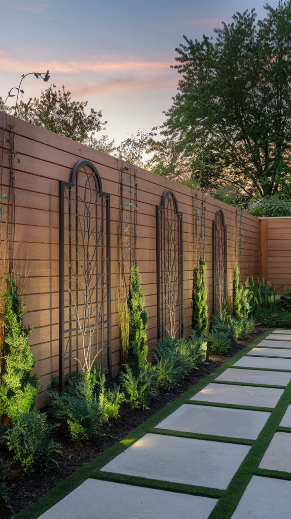A decorative trellis adds structure and style to your fence landscaping. Whether wood, metal, or vinyl, a trellis can support climbing plants or act as an elegant standalone feature. Try geometric patterns or arched designs for a sophisticated touch.