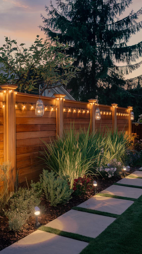 Strategic outdoor lighting enhances the ambiance and functionality of a fence landscape. Install LED strip lights along fence posts for a modern touch, or use solar-powered lanterns for an eco-friendly glow. String lights draped along the top of the fence add a cozy, inviting atmosphere, while uplights placed at the base highlight textures and plants.