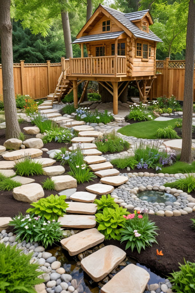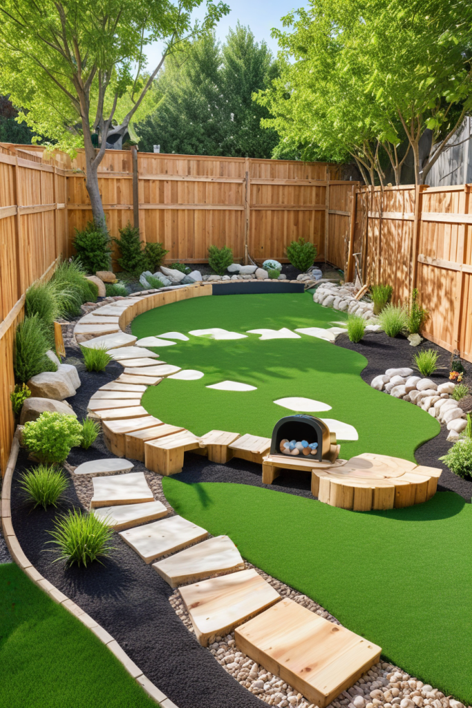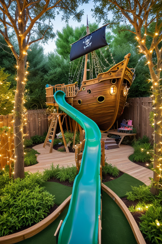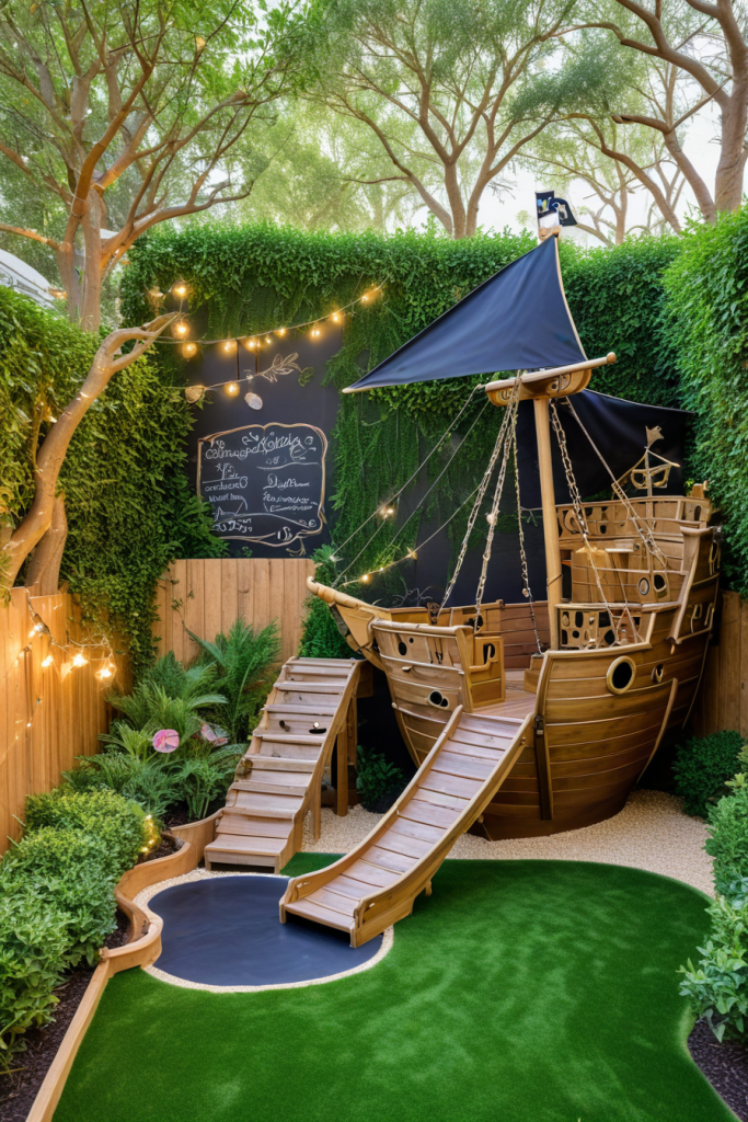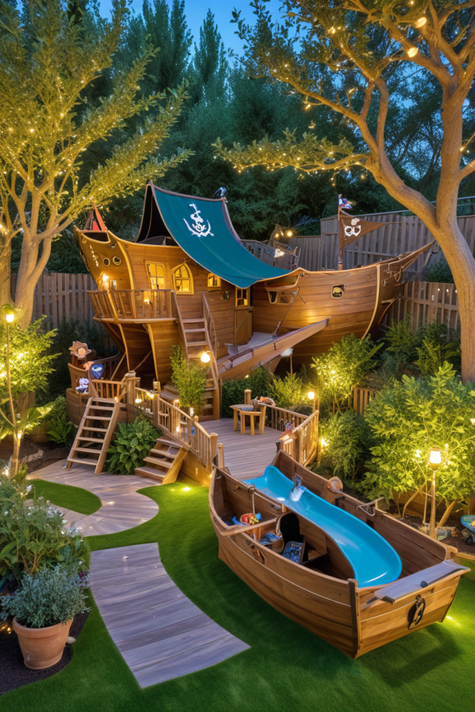 A castle, jungle, or pirate ship designed backyard can be a child’s wild imagination come to life. Integrating things like sensory paths, musical playstations, or chalkboard walls can make it more fun. Adventure courses, tunnels, and water play areas will keep children engaged for a long time while keeping them active.