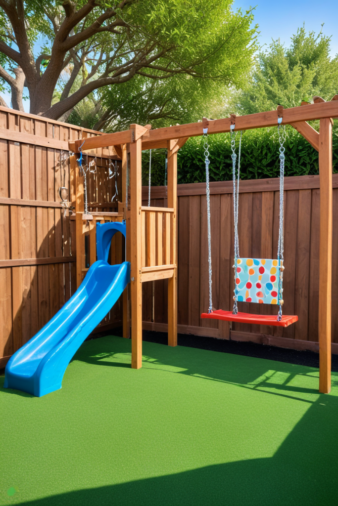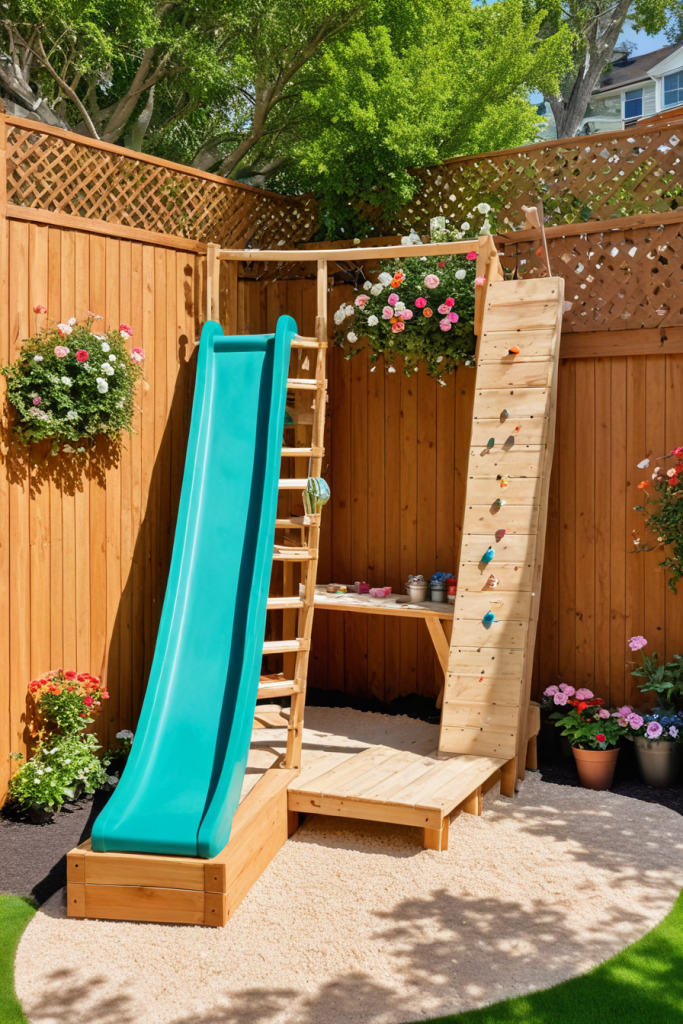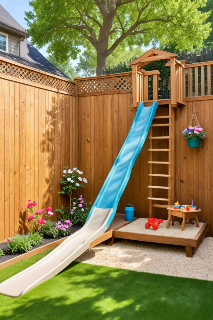A backyard space of any size can be utilized by adding fun vertical slides, climbing walls, and foldable slides for an engaging play area. Space-saving multifunction elements like picnic tables which double as sandboxes and compact trampolines can add versatility to the area.