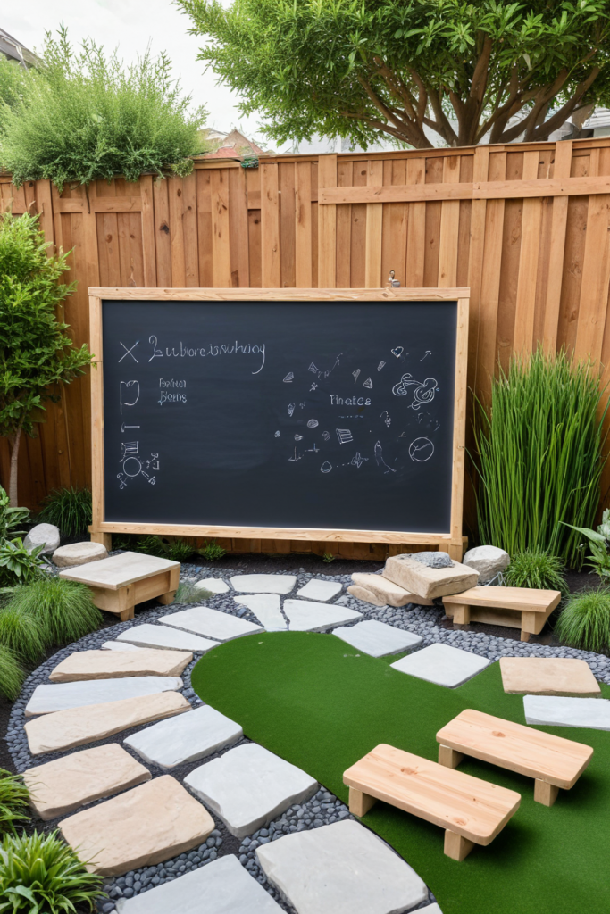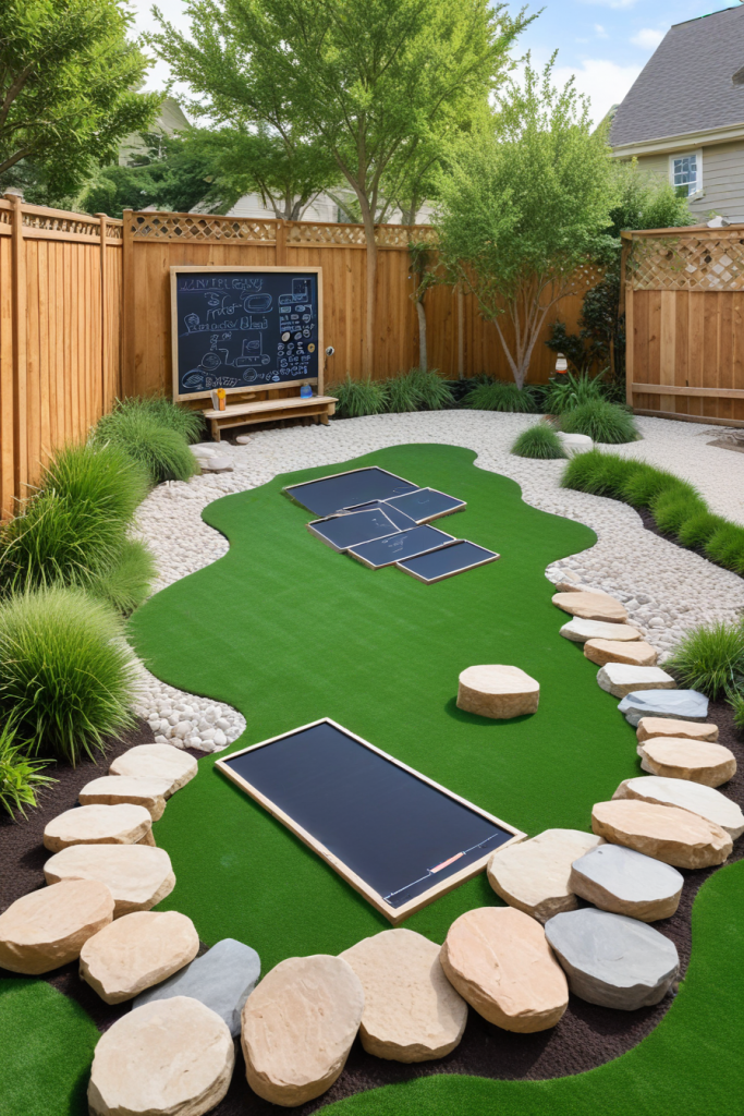 A kid’s backyard play zone enhances mobility, curiosity, and creative play. You can boost engagement with talking tubes, motion-activated lights, and sound-making stepping stones. Also, water and sand sensory zones, faux grass, and pebbles can be added. Games like chalkboards, DIY giant Jenga, and even mounted activity boards are great for fun and mental development.