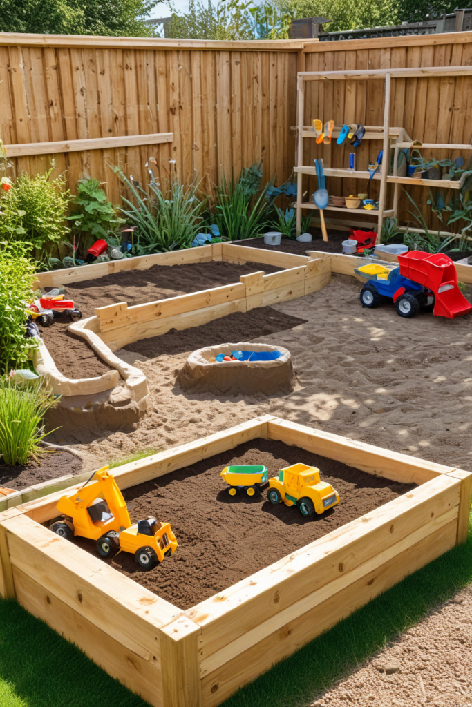 Building a sandpit and dirt sensory play area can make building something new far more engaging. A sandbox filled with soft, fine sand is wonderful for imaginative play, all while a sensory garden alongside it filled with pebbles, bark, and grass stimulates touch and sight. Adding water tables, kiedetic sand, or mud kitchens enhance hands on exploration even further. Buckets and digging tools, along with toy construction vehicles can create even more interactivity within the sandbox.