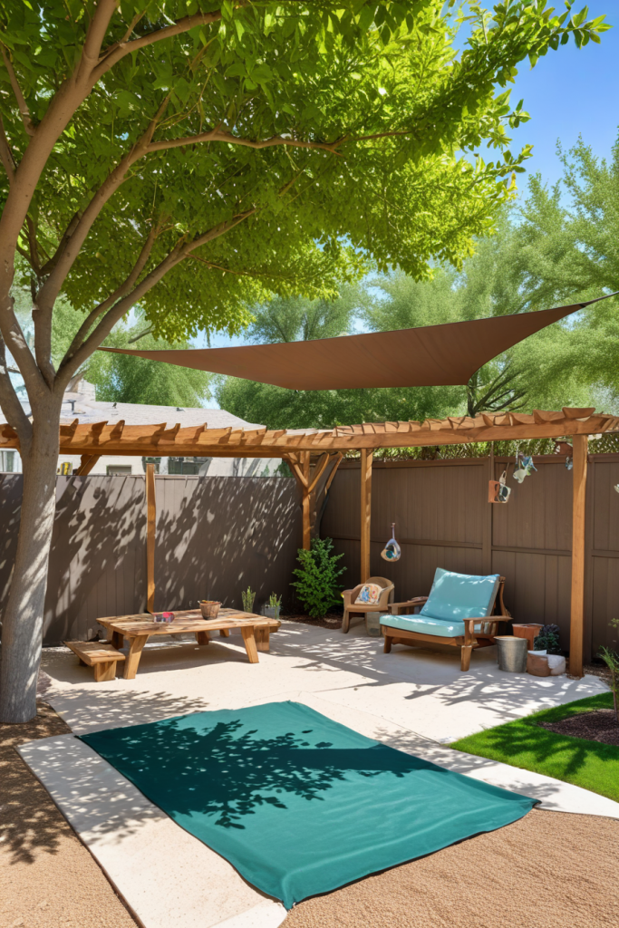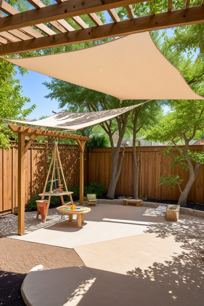 Having shade solutions keeps kids safe when playing particularly during summer months. Large sunsails, pergolas, and retractable awnings provide good options. Trees and bamboo curtains also provide long-lasting green solutions to shading. Covered playhouses, gazebos, and fabric canopies above swings and sandpits will keep kids comfortable while playing.