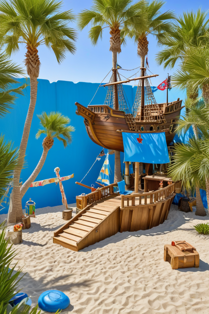 An einmalig gehaltenes Outdoor Spielplatz motiviert bestimmte Altersgruppen to get creative and motivates children to role-play. No matter if it´s a pirate ship, enchanted castle, jungle safari or space station. Having a theme makes free play more fun and more organized. Use painted backdrops, custom-built structures, and props to enhance the theme. Even a simple decoration like treasure chests for a pirate setup and glow in the dark planets for the star theme increases immersion of the playtime.
