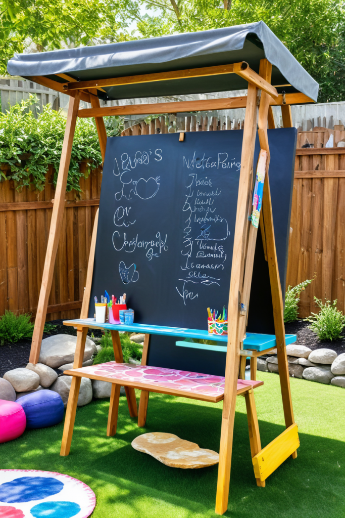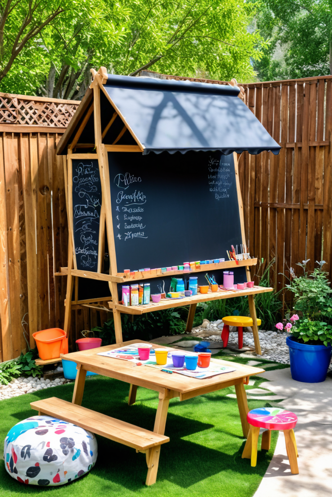 An imaginative backyard play space gives kids the freedom to engage in various forms of creative expression. Set up a craft zone complete with an outdoor chalkboard wall and an easel station stocked with weatherproof paints, and even a DIY rock painting station. Kids love when outdoor tables are strong enough for sculpting, finger painting, and other crafty DIY projects. Spice things up by adding a “spray paint” wall where children are free to create murals using water-based, washable paints.
