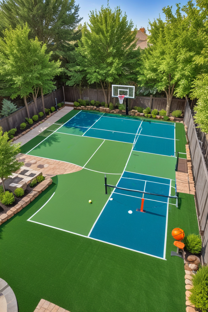 An outside sports area promotes good health through recreational activities and gentle competition. Build a small soccer pitch with goalposts, set a basketball net, or place a backyard bowling set. For multifunctional areas, set a net for volleyball, badminton, or tennis. Painting lines for the boundary or laying down outdoor carpets will guarantee an area where sports can be played. Seating for friends and family is a bonus.