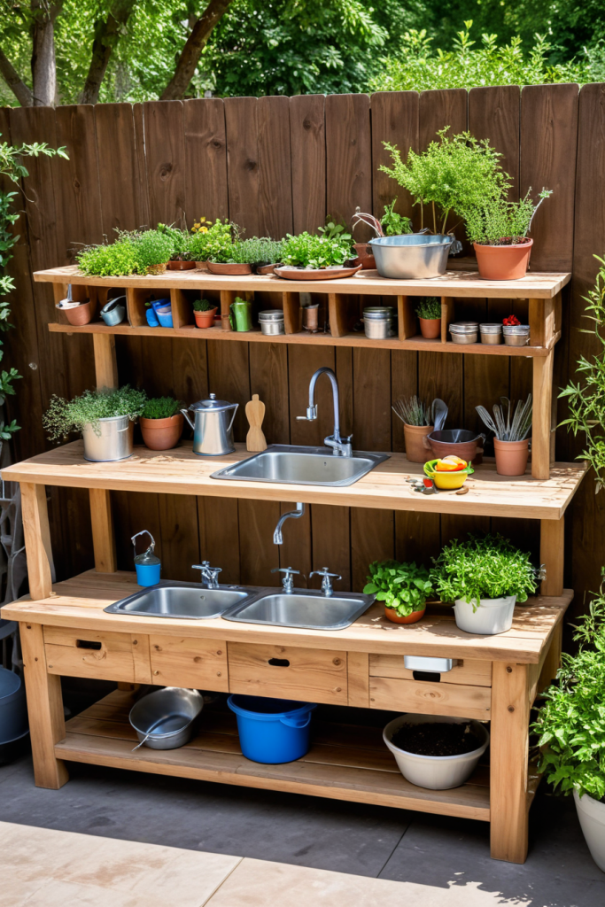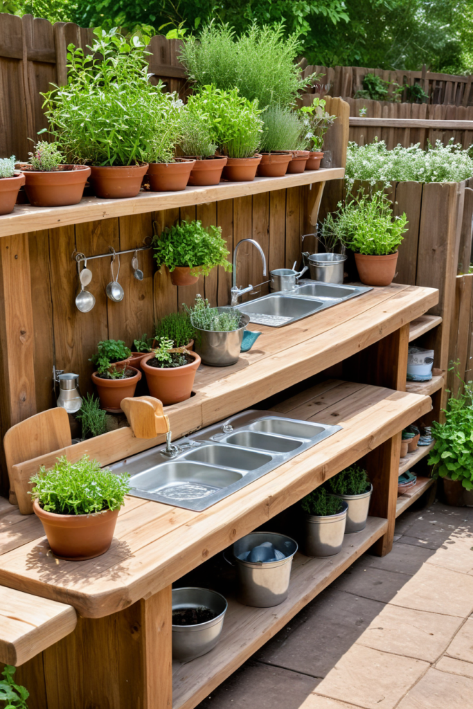 A mud kitchen offers children an active multisensory experience by combining scooping and mixing with movement. A wooden counter with sinks, old pots and pans, and an open shelf filled with “ingredients” will make their pretend play more realistic. To make it even better, a little herb garden for “cooking” and a water station with refillable buckets can always increase the fun. Also, using weatherproof materials makes sure kids can play year-long.