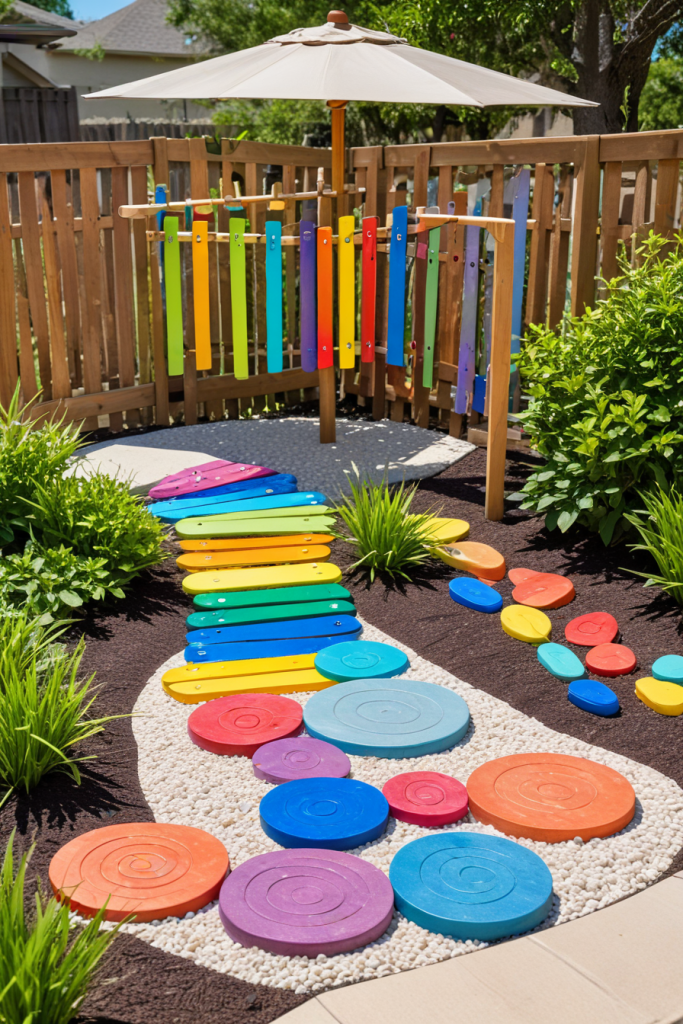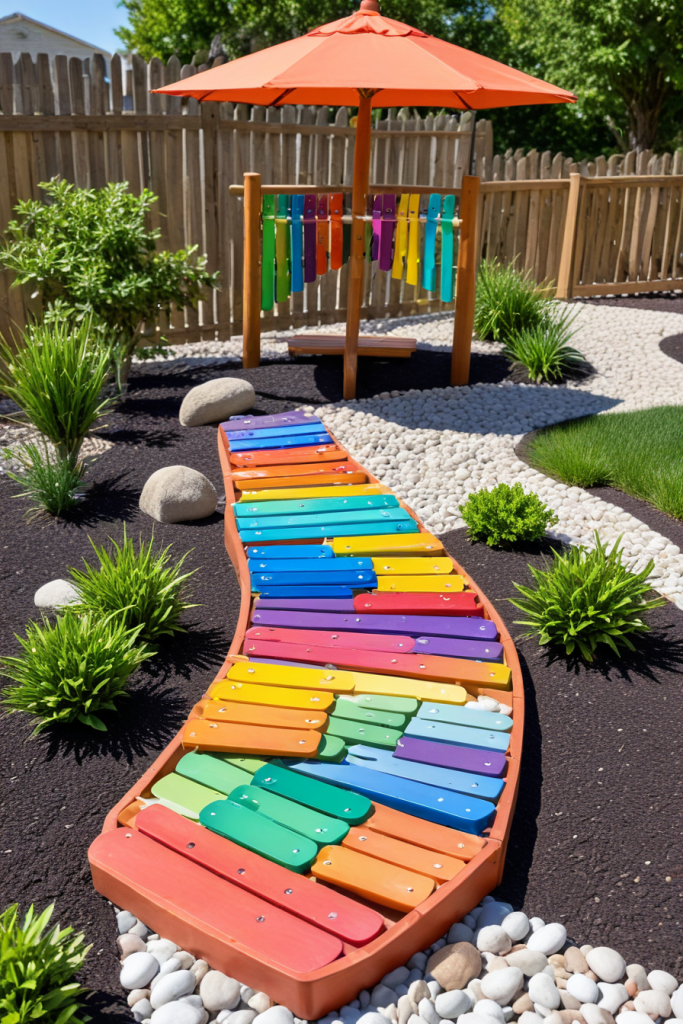 An activity focusing on music and sensory development enhances creativity and improves motor skills. Put up outdoor xylophones and drum stations or make do it yourself wind chimes for children to explore music. A sensory pathway with varying textures such as wood, grass and small pebbles stimulates the sense of touch. Colorful spinning wheels and bubble stations enable visual and interactive play. Think about installing whisper tubes so children can talk to each other from different sections of the play area.