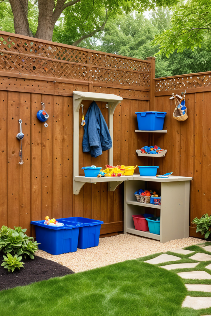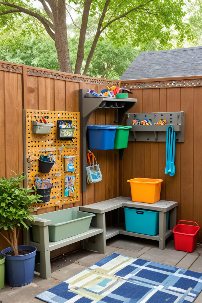 Having a backyard play area arranged in an orderly manner not only gets rid of clutter but also ensures that the toys and other play equipment last longer. Store Weatherproof storage benches, labeled bins, as well as wall-mounted pegboards, can help sort and arrange items. Use an outdoor cabinet or a small storage shed to keep larger ride-on toys and sports equipment. Clutter can be easily managed in small areas using hanging mesh bags and collapsible storage units.