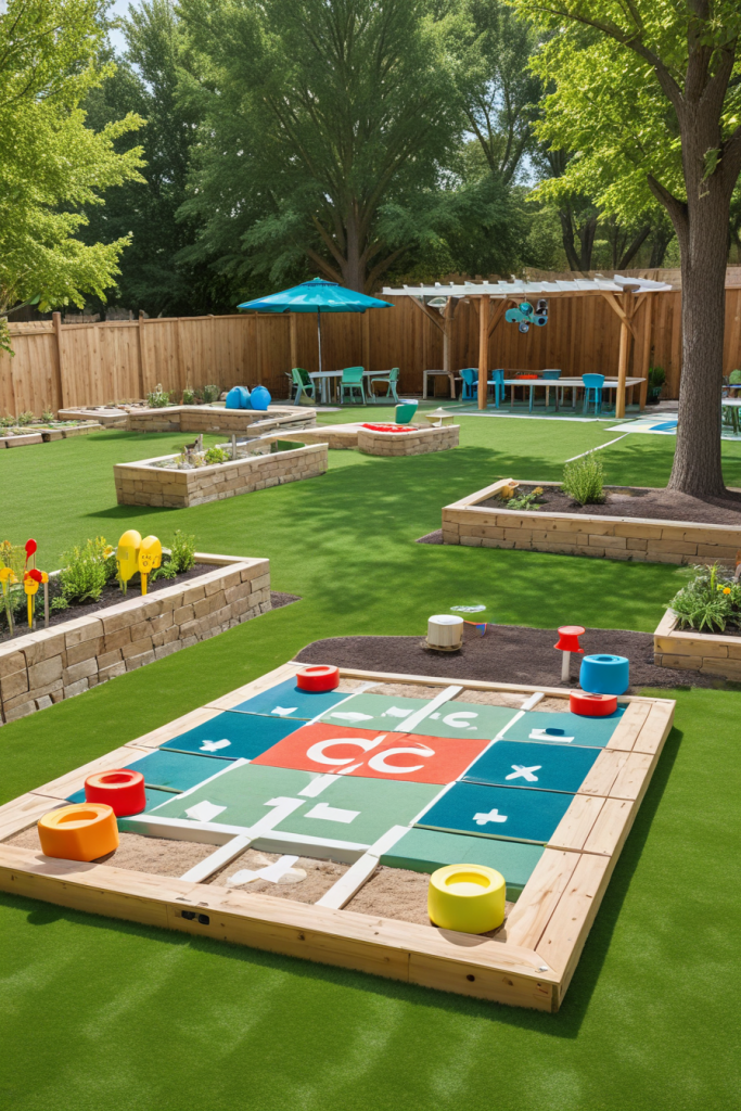A communal backyard recreation space stimulates collaboration and social engagement. Set up cooperative games like giant tic-tac-toe, an outdoor bowling lane, and a mini soccer field. Activity zones like scavenger hunts and mud pie kitchens make for fun shared activities. Picnic tables and seating areas help bring kids together for rest and group play.