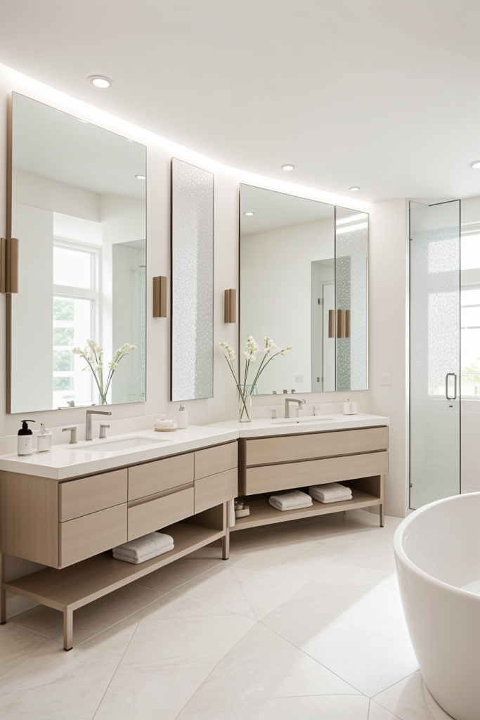 Mirrors and glass Statement accents in a bathroom design are a major attention grabber, adding a certain depth and character to that space. Light is reflected and amplified by oversized mirrors, artistic glass panels, and other innovative reflective surfaces creating an illusion of greater space which enhances the overall beauty of the room.
