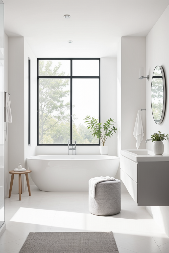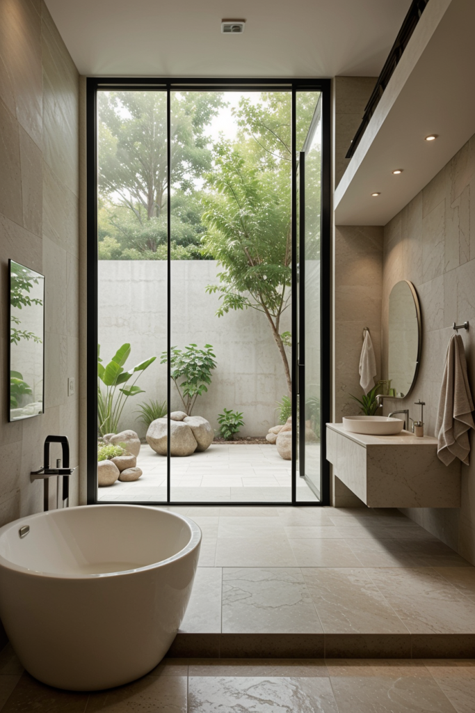 Incorporating aesthetic minimalistic interior decoration with modern seamless large glass doors, natural stone materials, and ample flora in bathrooms approaches, while simultaneously removing borders, enhances the luxurious nature and inner harmonious. Modern design principles are combined with bathroom aesthetic dekor to create a serene living space.