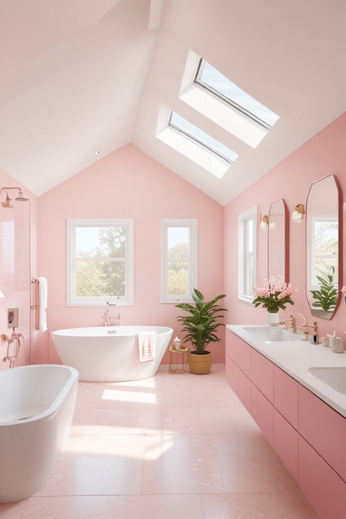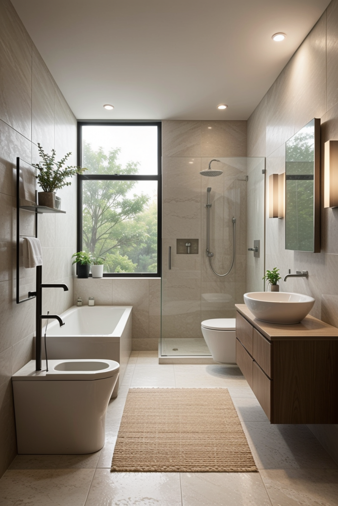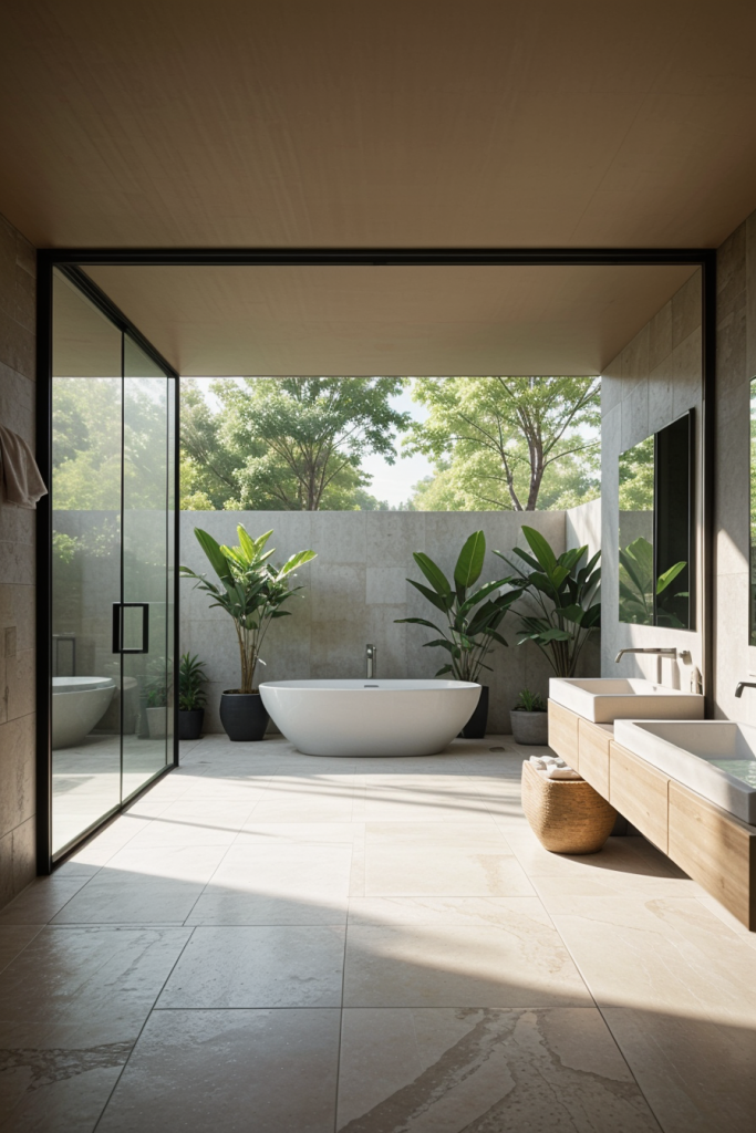 Incorporating aesthetic minimalistic interior decoration with modern seamless large glass doors, natural stone materials, and ample flora in bathrooms approaches, while simultaneously removing borders, enhances the luxurious nature and inner harmonious. Modern design principles are combined with bathroom aesthetic dekor to create a serene living space.
