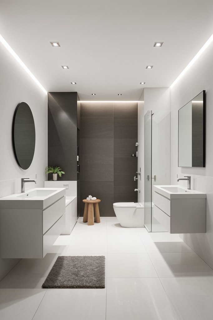 Minimalism paired with impactful fixtures and finishes is what gives focus to bathroom designs, merging clean lines with purpose. A perfect example of this is the expertly designed space accomplished through the combination of sleek faucets, refined surface finishes, and subtle hardware and the latter exudes modern simplicity while simultaneously serving a bold visual statement.