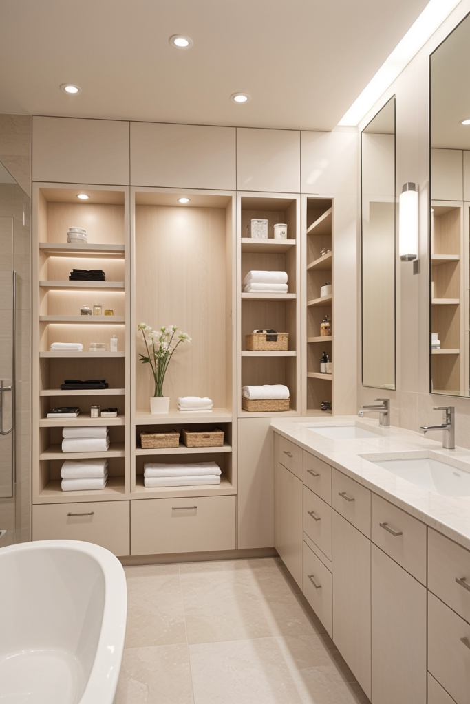 With modern technology, storage solutions have become innovative which improved aesthetic dekor and functions normally performed in bathrooms. Ingeniously concealed built shelving, hidden compartments, and custom cabinetry offer sufficient space while preserving the sleek contours of contemporary design.