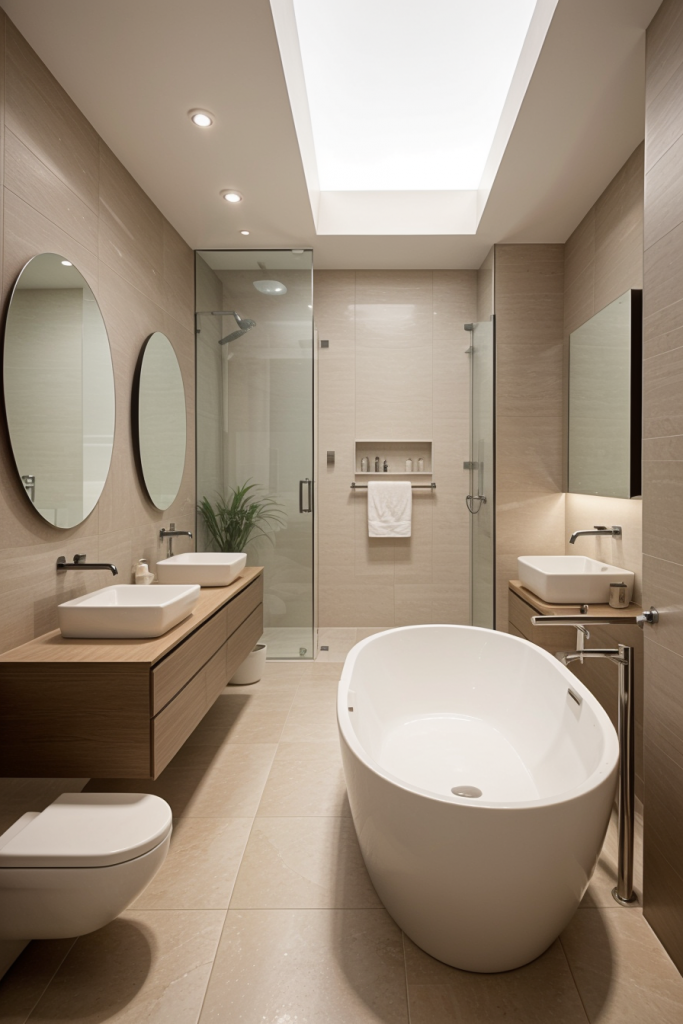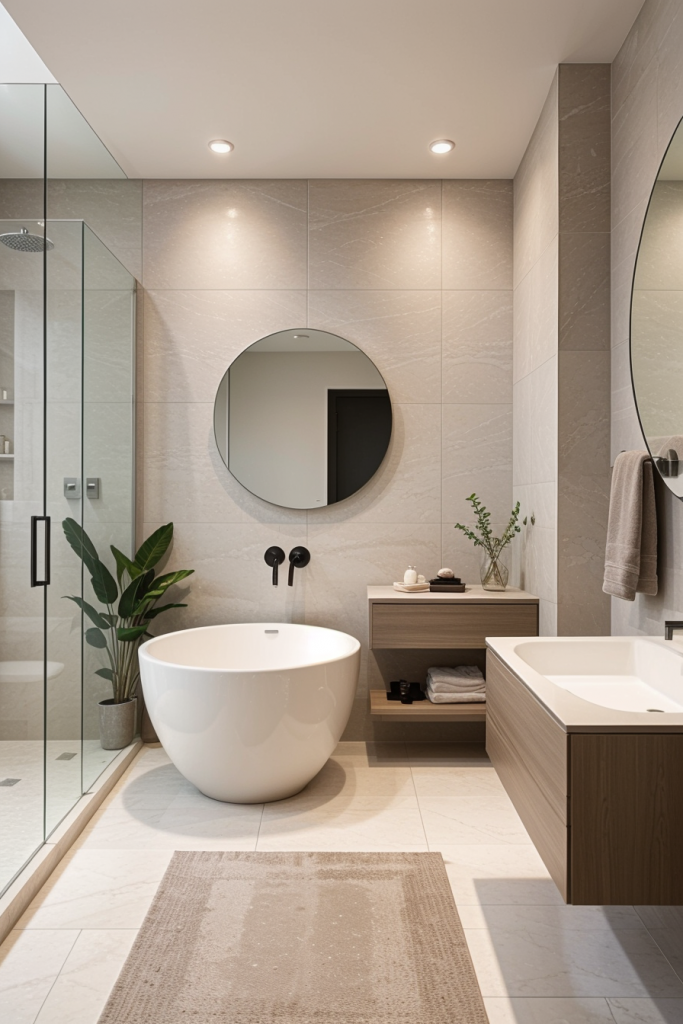 Contemporary bathrooms are designed in a way which combines appealing lines and warm elements simultaneously. This blend offers visual appeal as well as high practicality. A blend of minimalistic style furniture, modern storage features, and delicate decorative accents is the best fit for this modern approach, which is perfect for people who like neat, uncluttered yet cozy spaces.