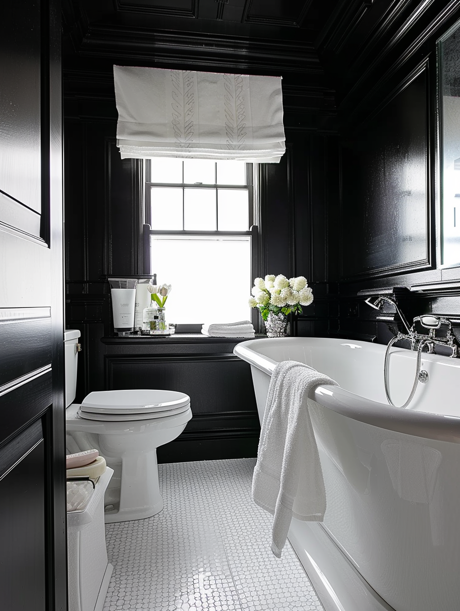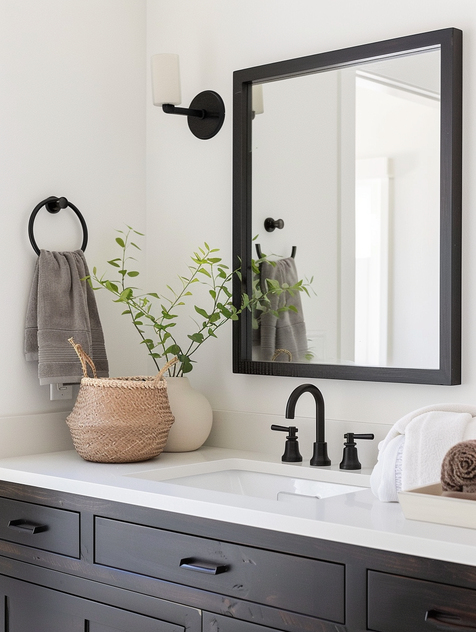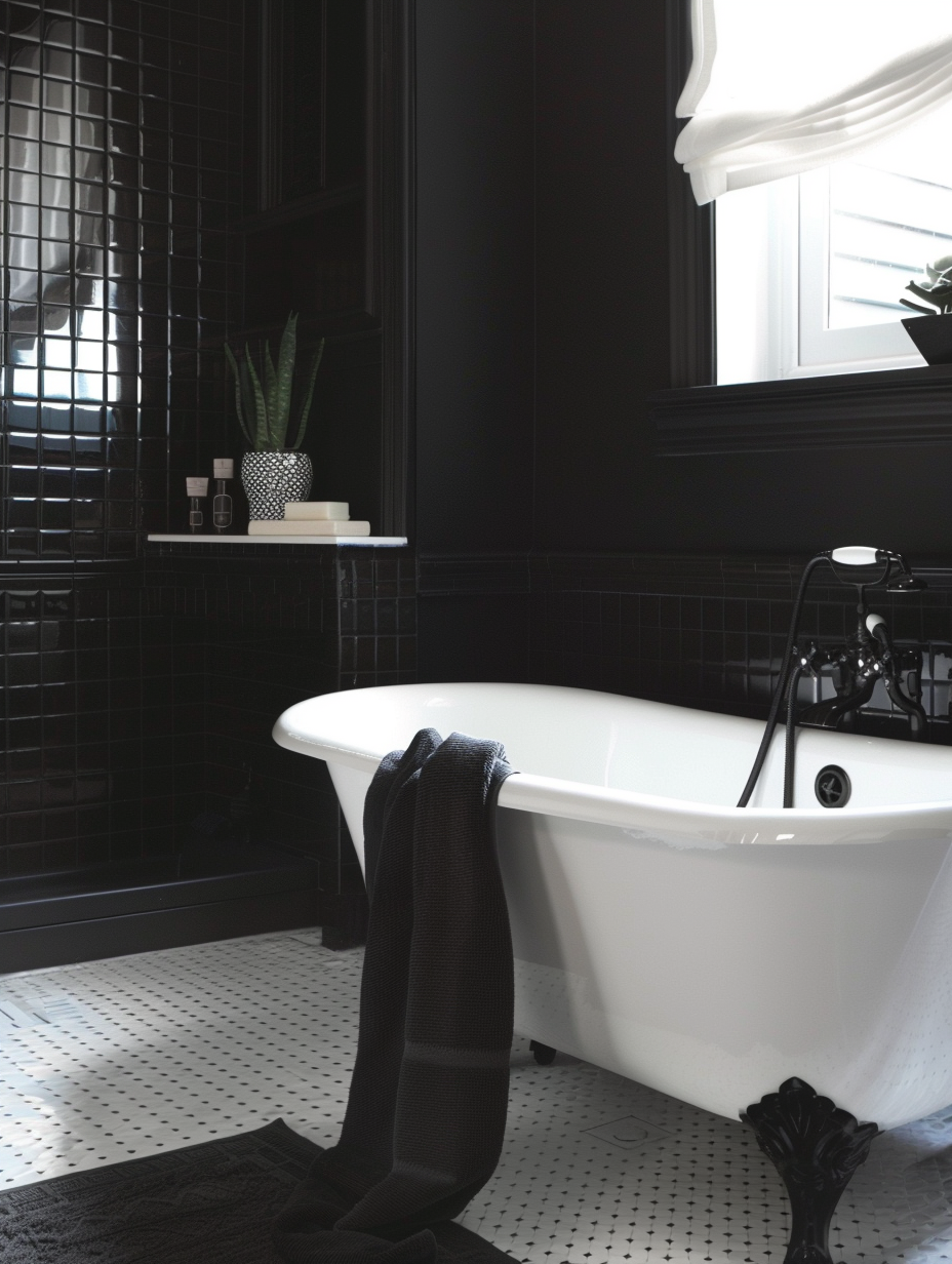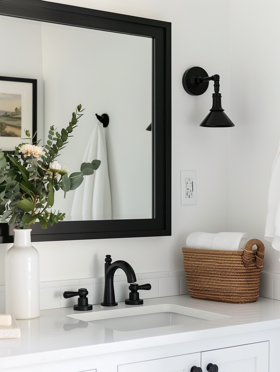 Simple and straightforward black touches give an up-to-date and minimalist style to your bathroom. Black fixtures and accessories next to walls painted white or light colors intensify this minimalist aesthetic. Don’t postpone things such as a black-framed mirror, matte black faucets, and simple decor to finish the layout. This design is simply awesome for style lovers who prefer edgy minimalism.