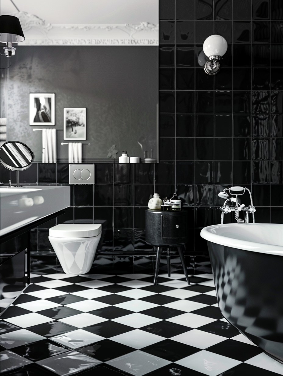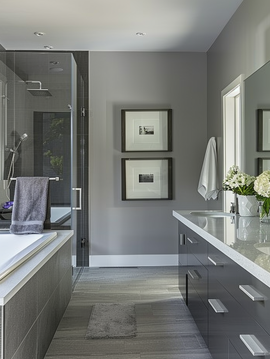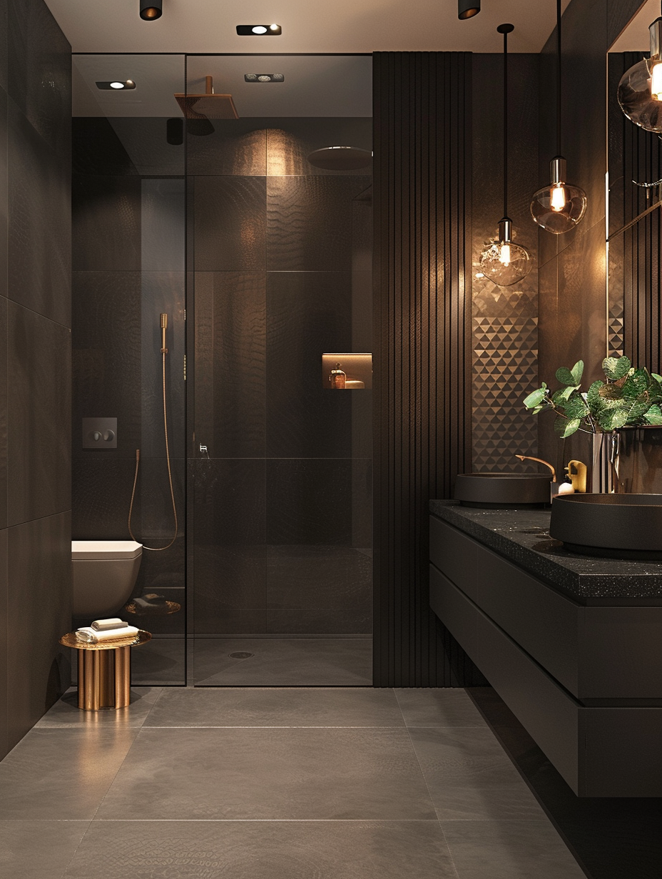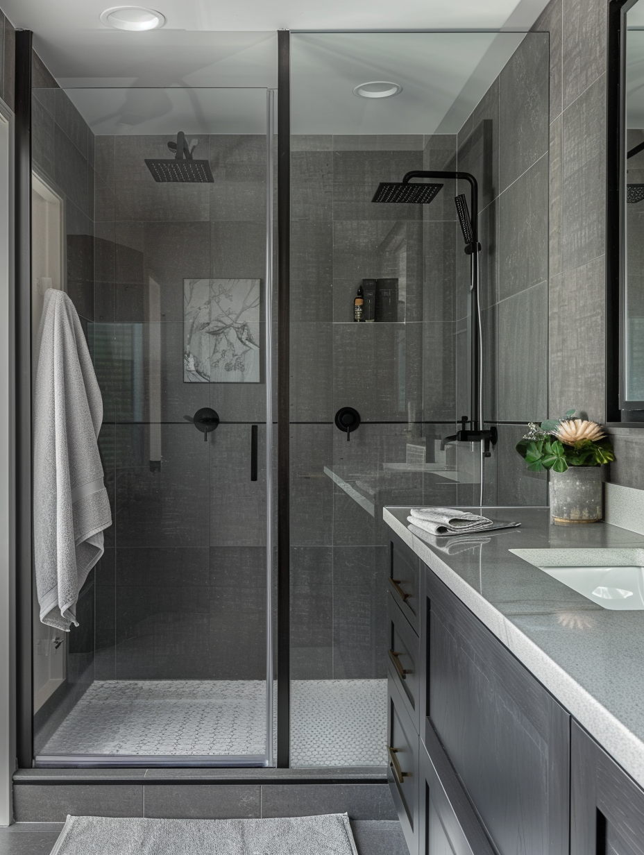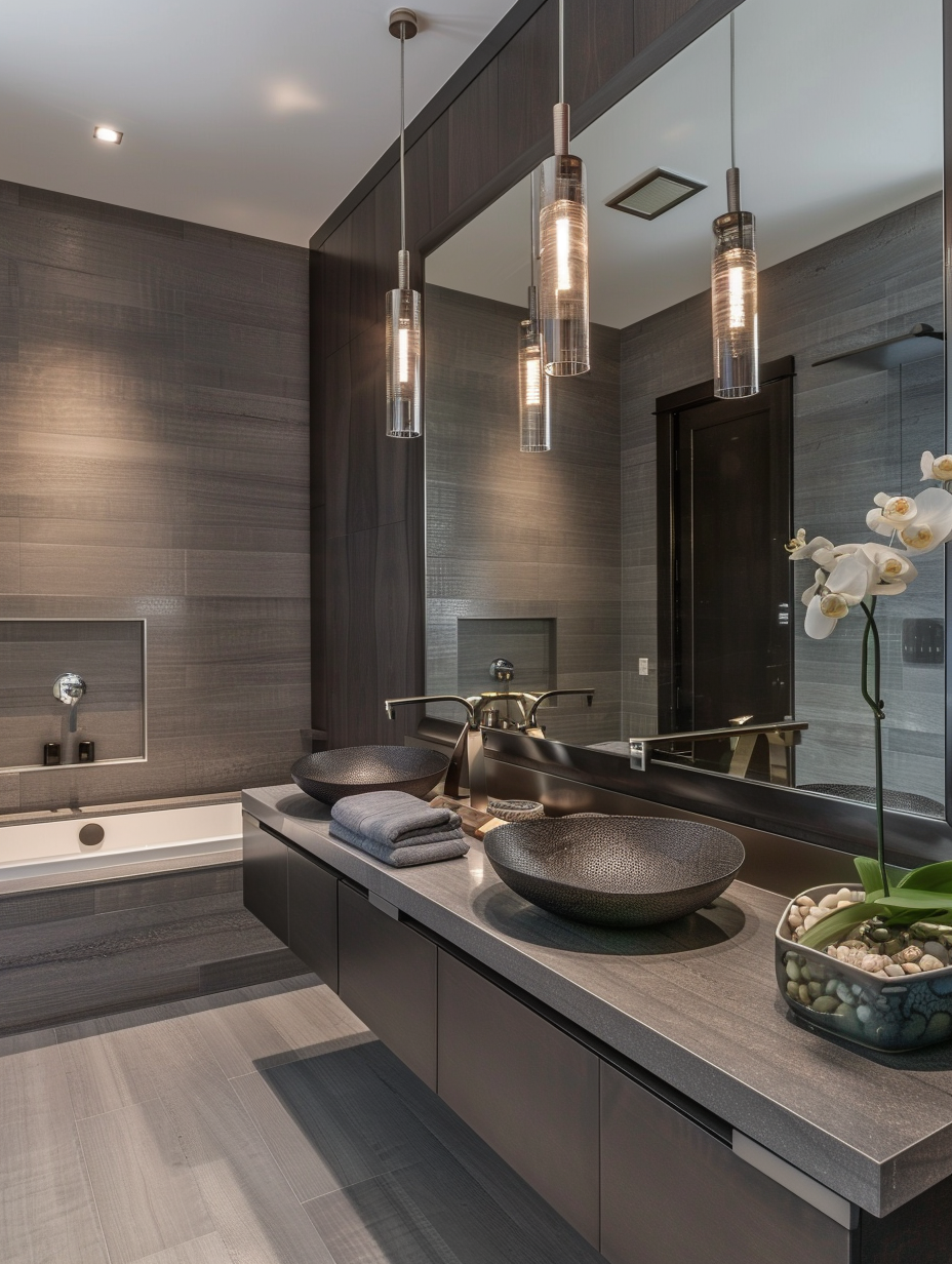 A timeless bathroom decorated with graphites and charcoals forms a modern and sleek look. The use of several shades of charcoals and graphites on the walls, as well as metal fixtures and minimalistic decor, exudes a classy and current theme. Additional features such a glass shower enclosure, a sleek vanity, and geometric patterns can be used to add the modern feel. Such design is suitable for individuals who like a trendy and multifunctional bathroom.