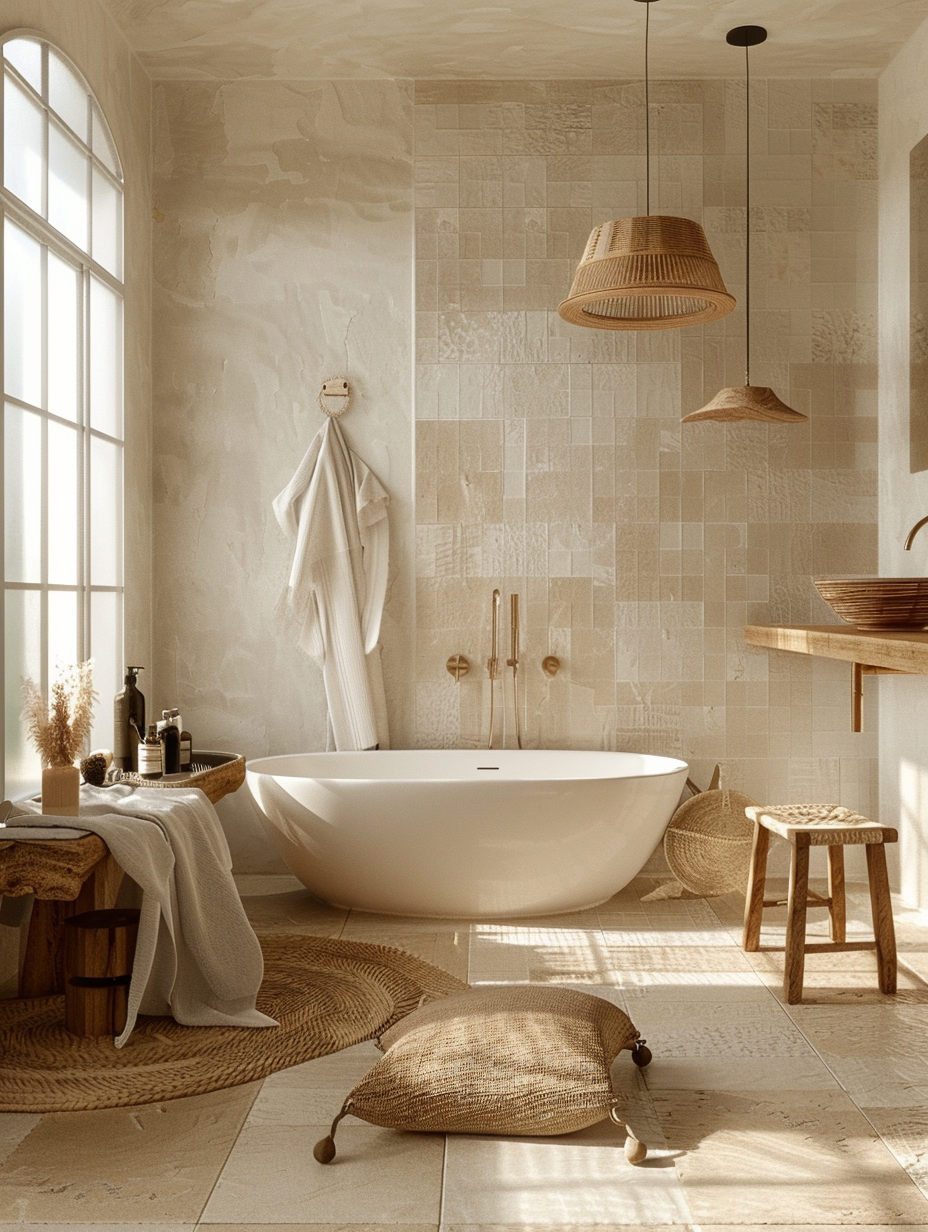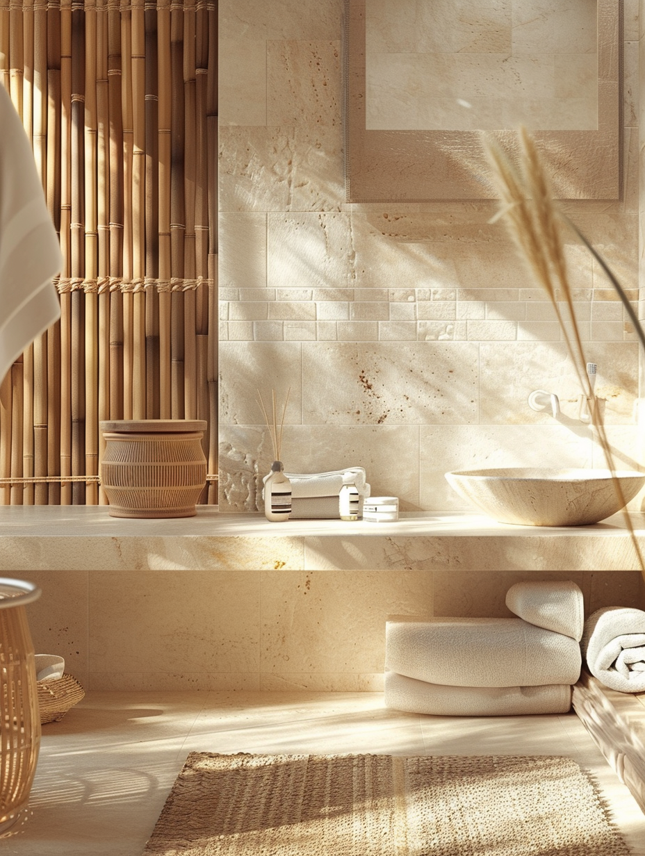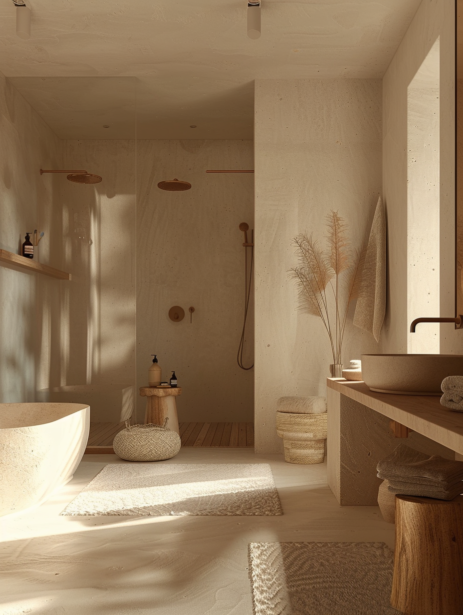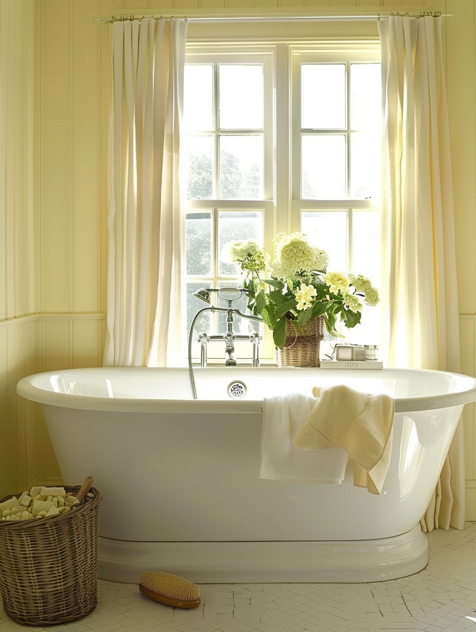 By using light, the cheerfulness and liveliness of the bathroom are brought out. Through the blending of Soft yellow walls, white fittings and wood features linked with nature a vivid and sunny space is produced. Such a space may be more animated by including fresh flowers, wicker baskets, and light-colored curtains. This concept is well-suited for anyone looking to have a warm and welcoming bathroom.