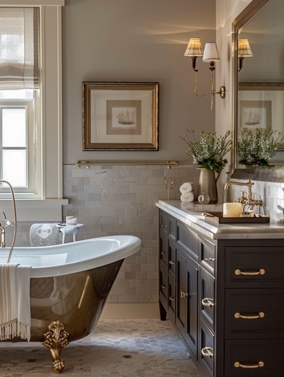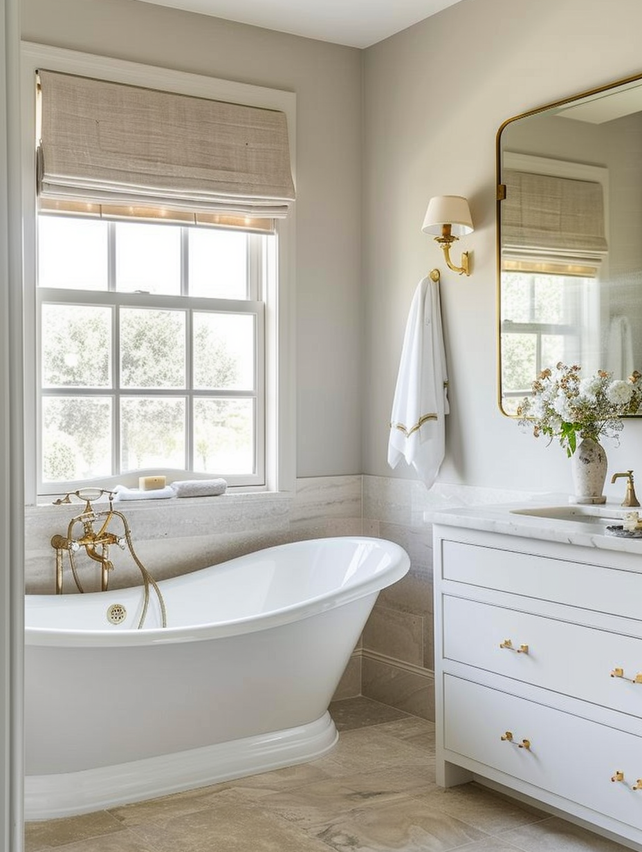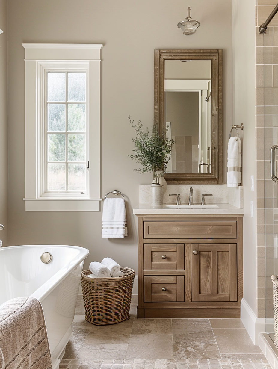Classical shades are the masterpiece of the bathroom that looks very nice and warm invitees. Warm and off-white walls, with neutral fixtures and natural materials, create a simple and stylish environment. You can add items like wooden elements, soft lights, and minimalistic designs in order to make it visually appealing. This bathroom design is perfect for homeowners who like spaces that are warm and inviting.