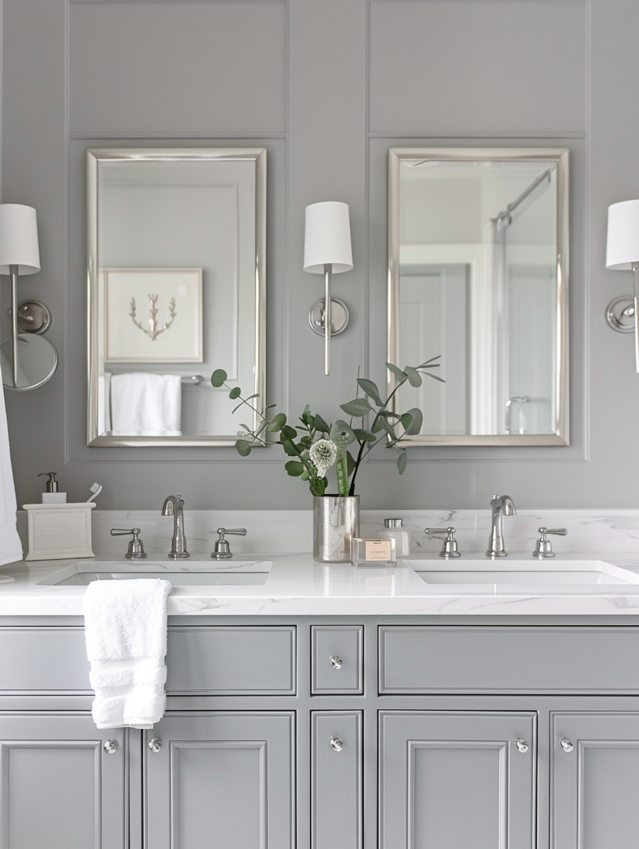 Subtle silver and grey colours contribute to a chic bathroom design with a touch of modernity. The bright grey walls together with the exception of silver still produce sleek, modern, and therefore a bit unconventional style. To secure the understated elegance, incorporate designs, for example, gray vanity, silver-framed mirrors, and minimalist decor. This type is personified by those who want a sleek, modern and comfy bathroom.
