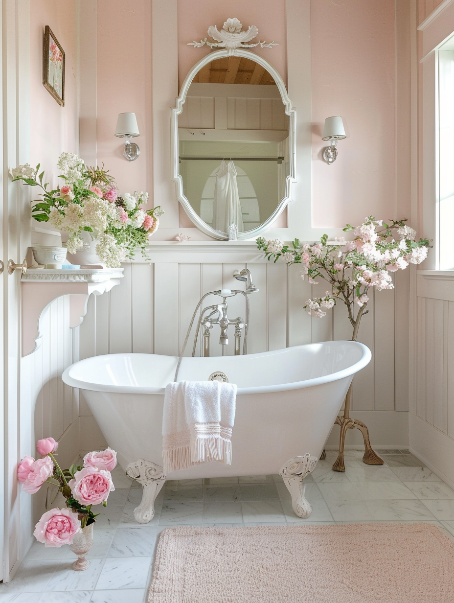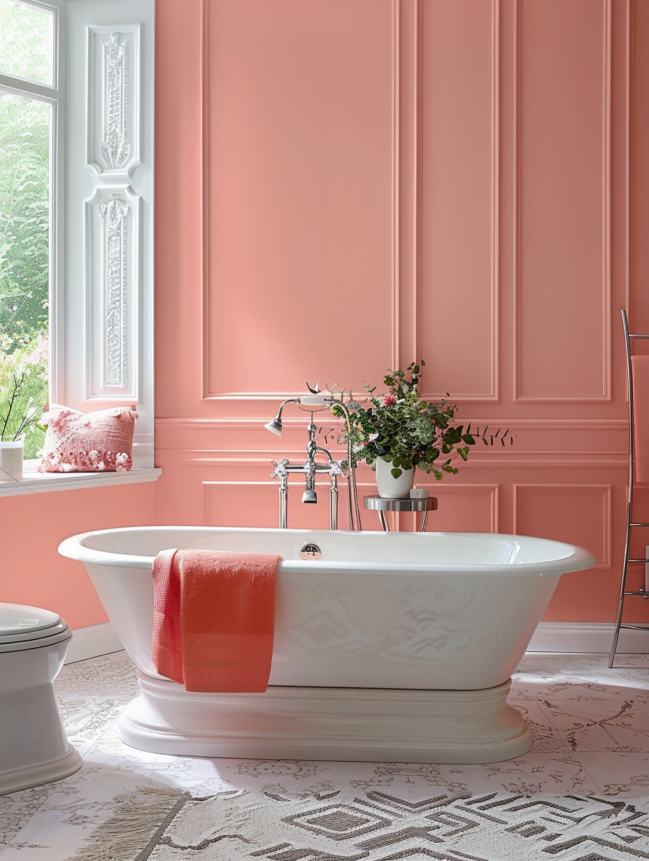 Soft and romantic pinks may be turned into a charming and elegant retreat for your bathroom. Pink designed walls paired with white or cream fixtures and beautiful and unobtrusive flora make it a safe and very feminine area. Also, don’t ignore extra elements like an old-style mirror, gentle lighting, and pastel accessories in order to make the relaxing atmosphere more romantic. It is perfect for those who are in love with the little touches of elegance and whimsy.