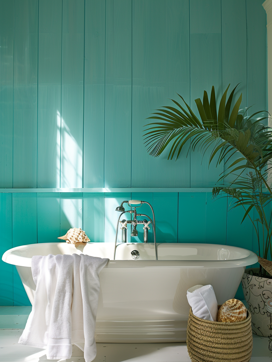 The tranquility and purity of the ocean are carried by turquoise which is the main focus of your bathroom. Blending the green-blue walls with white pieces and sandy beige details, this space is instantly transported to the beach, where the surroundings are soothing and pick-me-up. Multiply the substance by incorporating motifs like seashell decors, driftwood accessories, and fabric as a blanketing finish. This arrangement is specifically designed for those looking for a live beach holiday home.