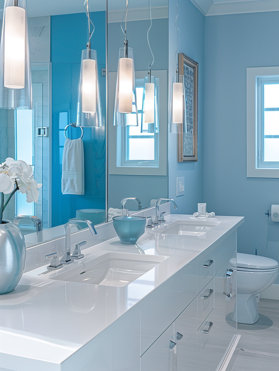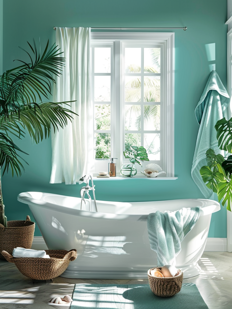 The bathroom, decorated in a blend of aqua and teal is supremely enlivened and rejuvenated. Choose aqua and teal, along with white or light grey fixtures and seashore themed decorations to create a lively, fresh and invigorating environment. Adding details like seashell embellishments, tropical plants, and soft towels to the scheme will make it picture perfect. This design is great for people who want to have an enriched and revived living space.