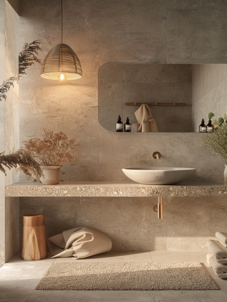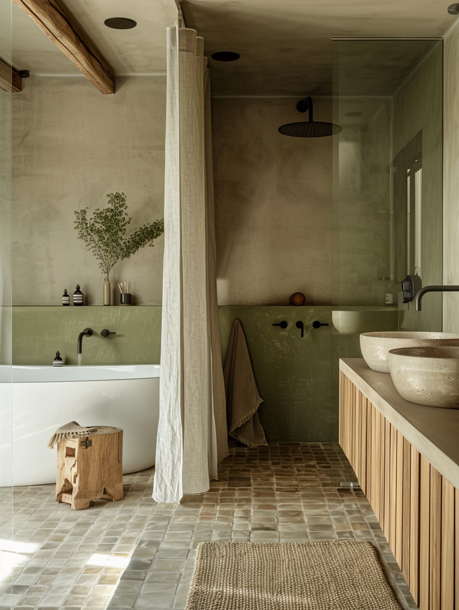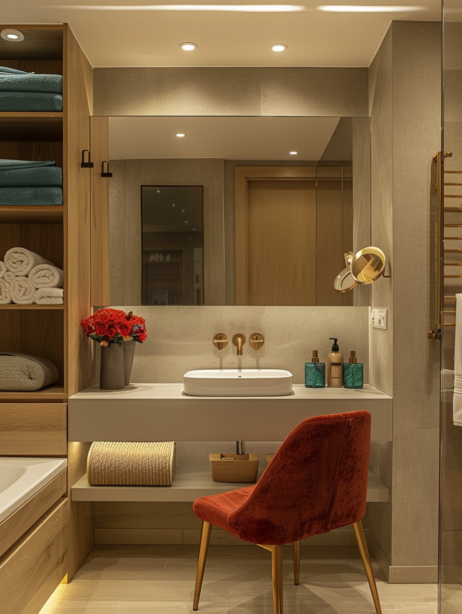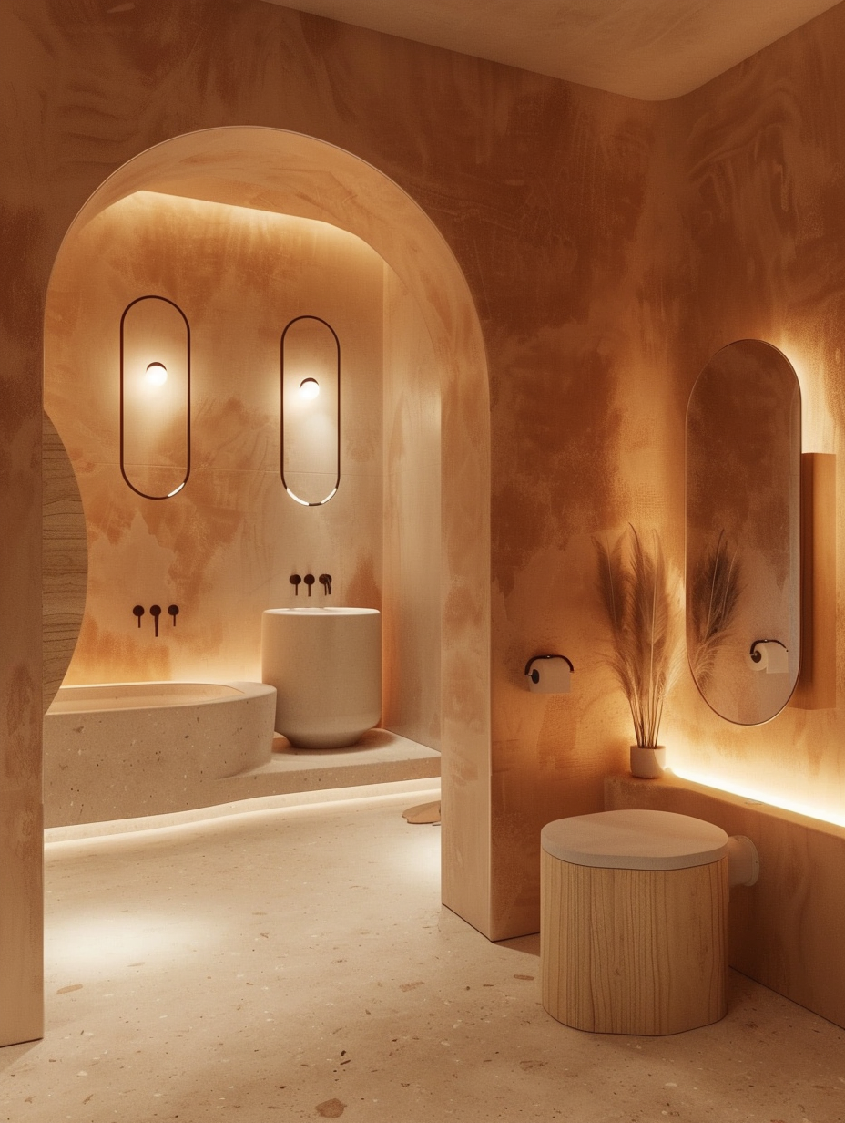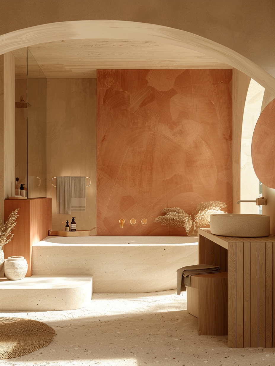 The use of warm shades like earthy browns, soft oranges, and muted yellows will turn the bathroom into a warm and welcome place. These are the most appropriate hues for making the area have that feeling of privacy and comfort. A warm color pallet with wood panels and dim light is an option to make the whole design more delightful.