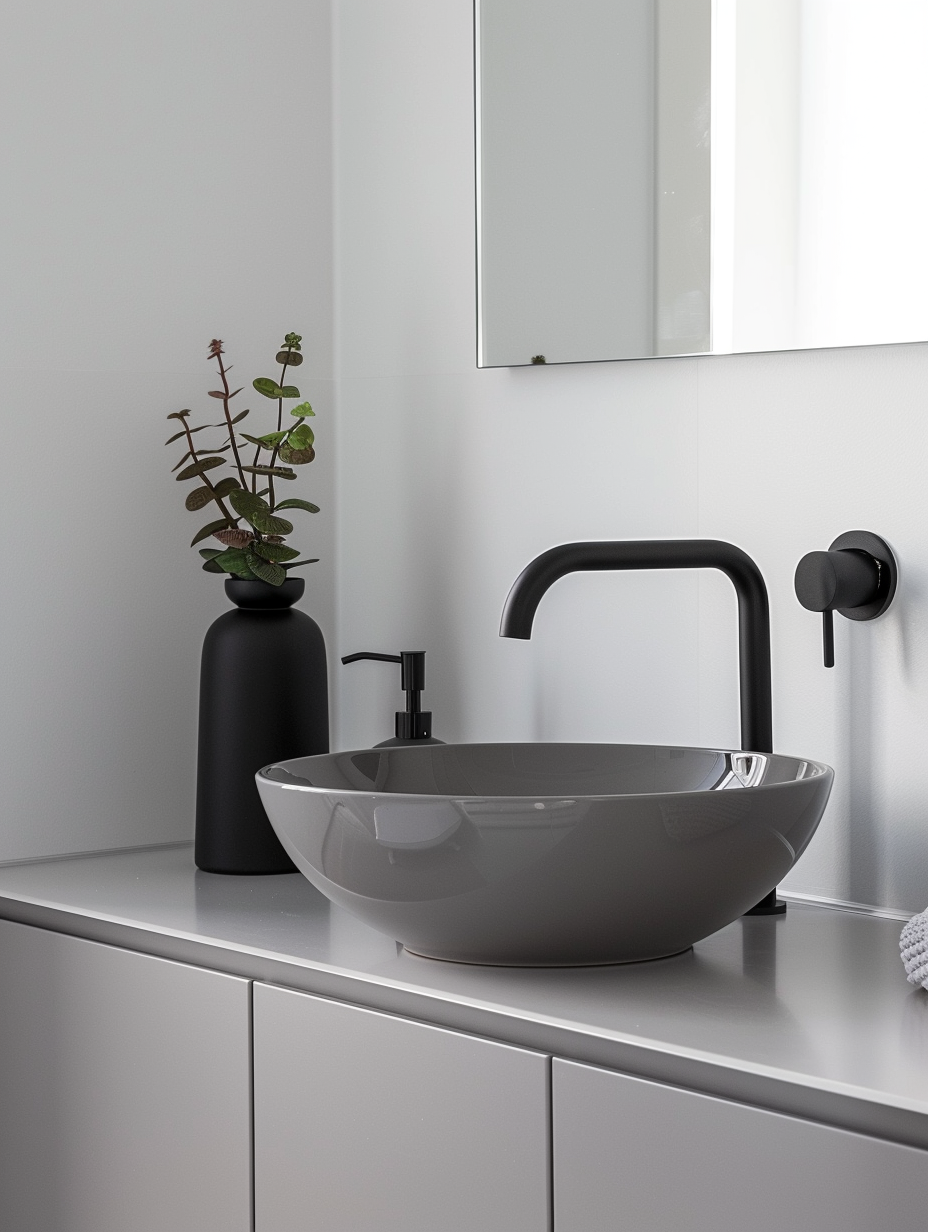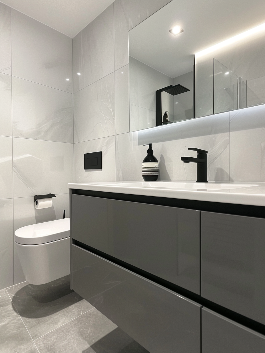 Matching the color of the bathroom fixtures to the wall is essential to have a complete and stylish bathroom. To illustrate, the combined unit of a grey vanity with grey walls can be a great way to follow through with an elegant and sophisticated look. Conversely, fixtures color juxtapositions can be the spotlight and the main attraction in the design.