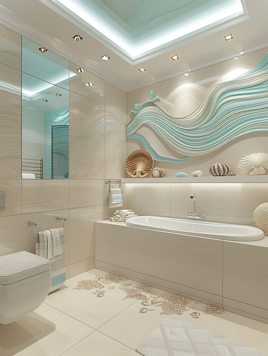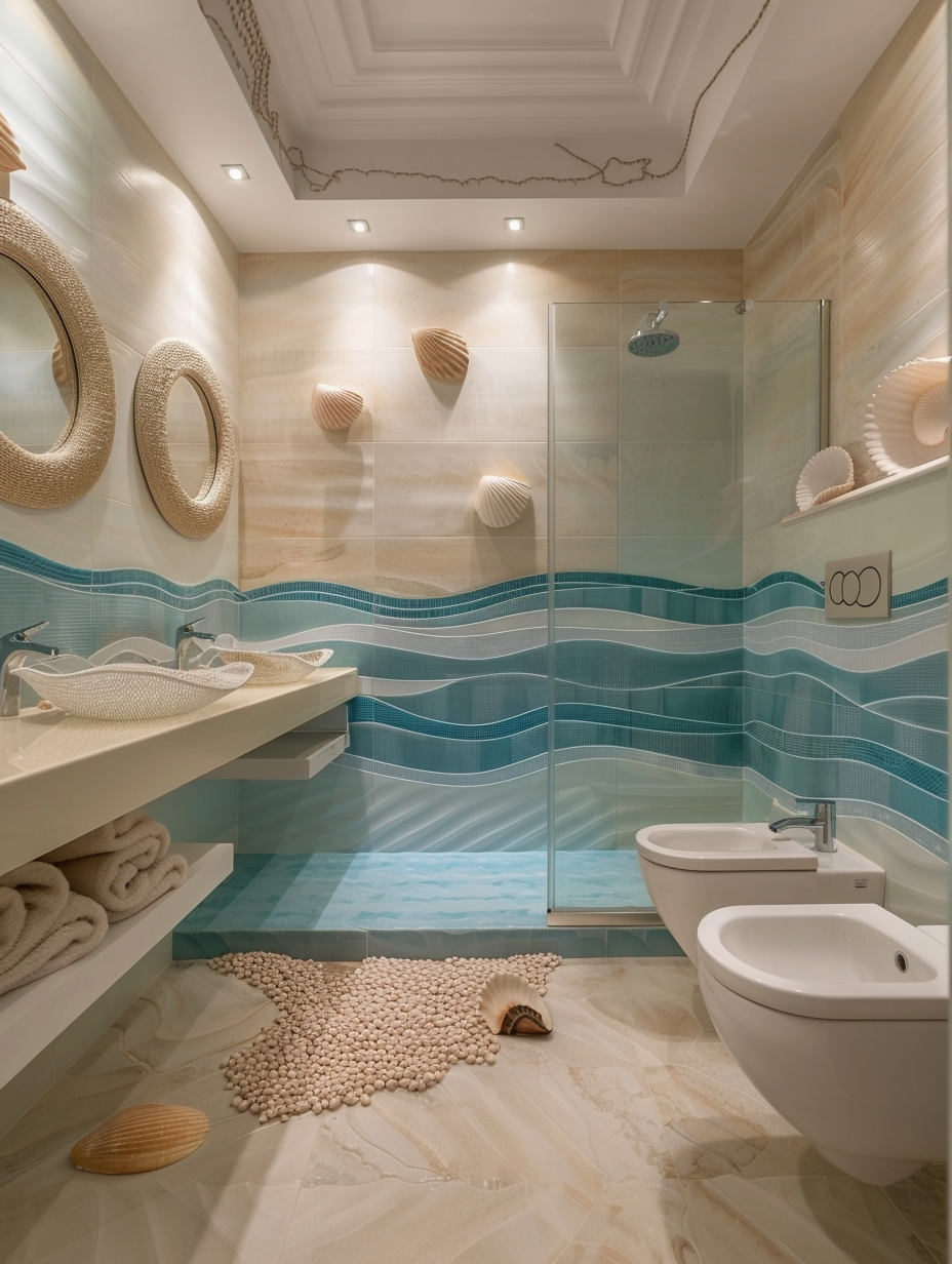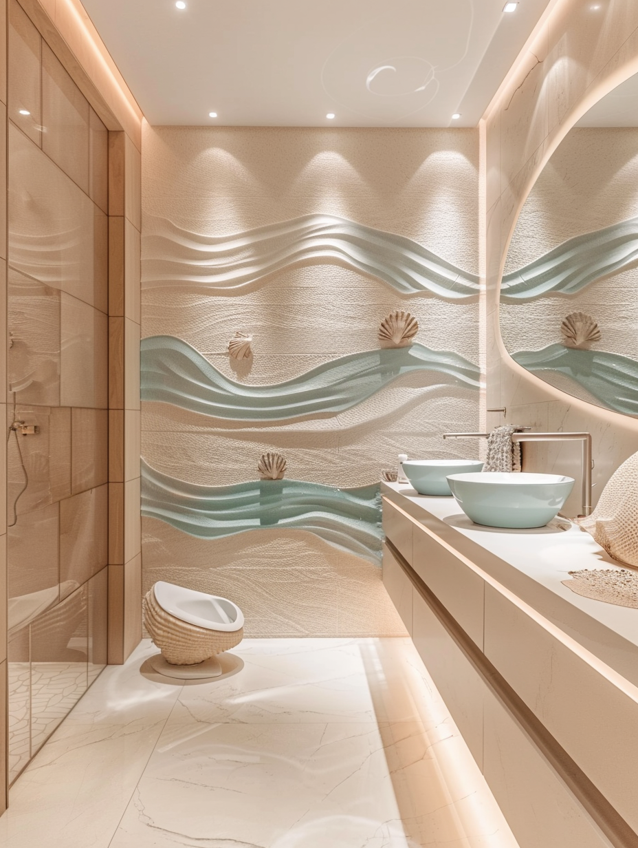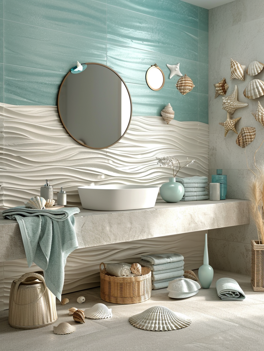 Beach-based colors such as beiges, blues, and greens of the aquamarine species can turn a bathroom into a coastal styled area. These tones bring out the peace and quiet of a holiday by the sea and are the best idea for a quiet and refreshing place to rest. The coastal theme in this room can be complemented by natural substances such as wood and rattan.