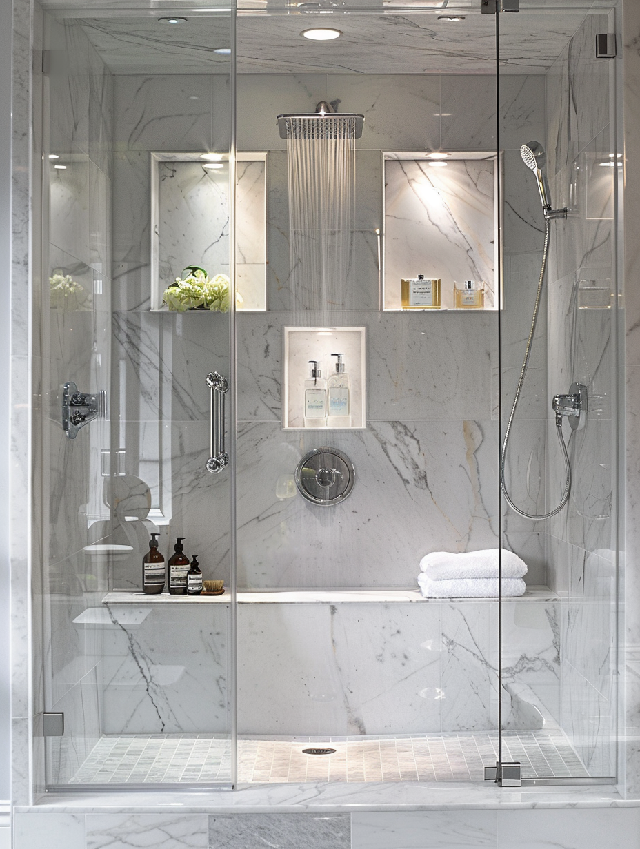 Spa-inspired showers imitate the feeling of being in a luxurious spa. Such showers are usually equipped with such things as a rain shower head, multiple body jets, and niche ideas for storing bath products. For instance, you may opt to install luxurious materials like marble and natural stone and high-end fixtures to foster a fancy and elegant environment.