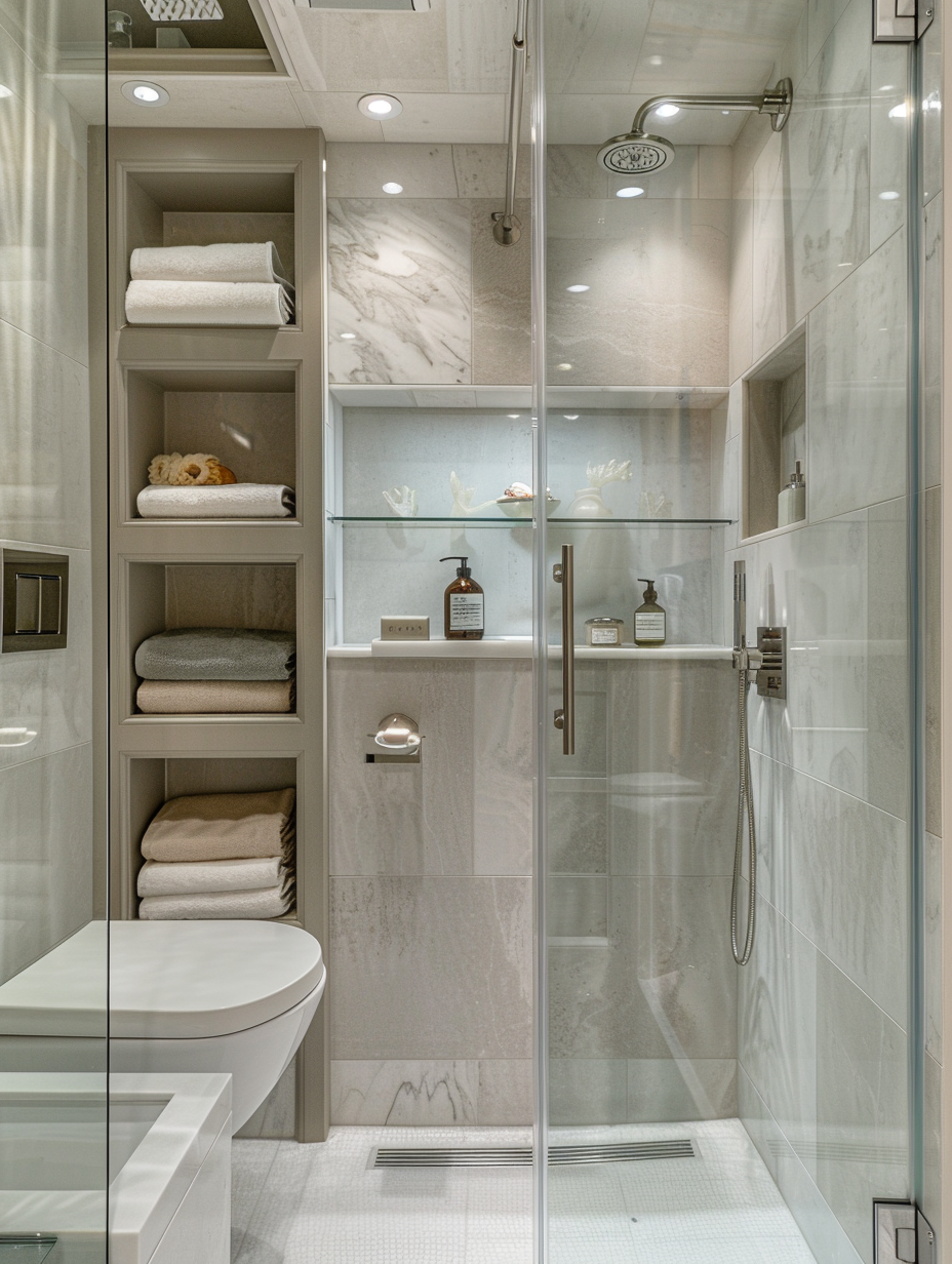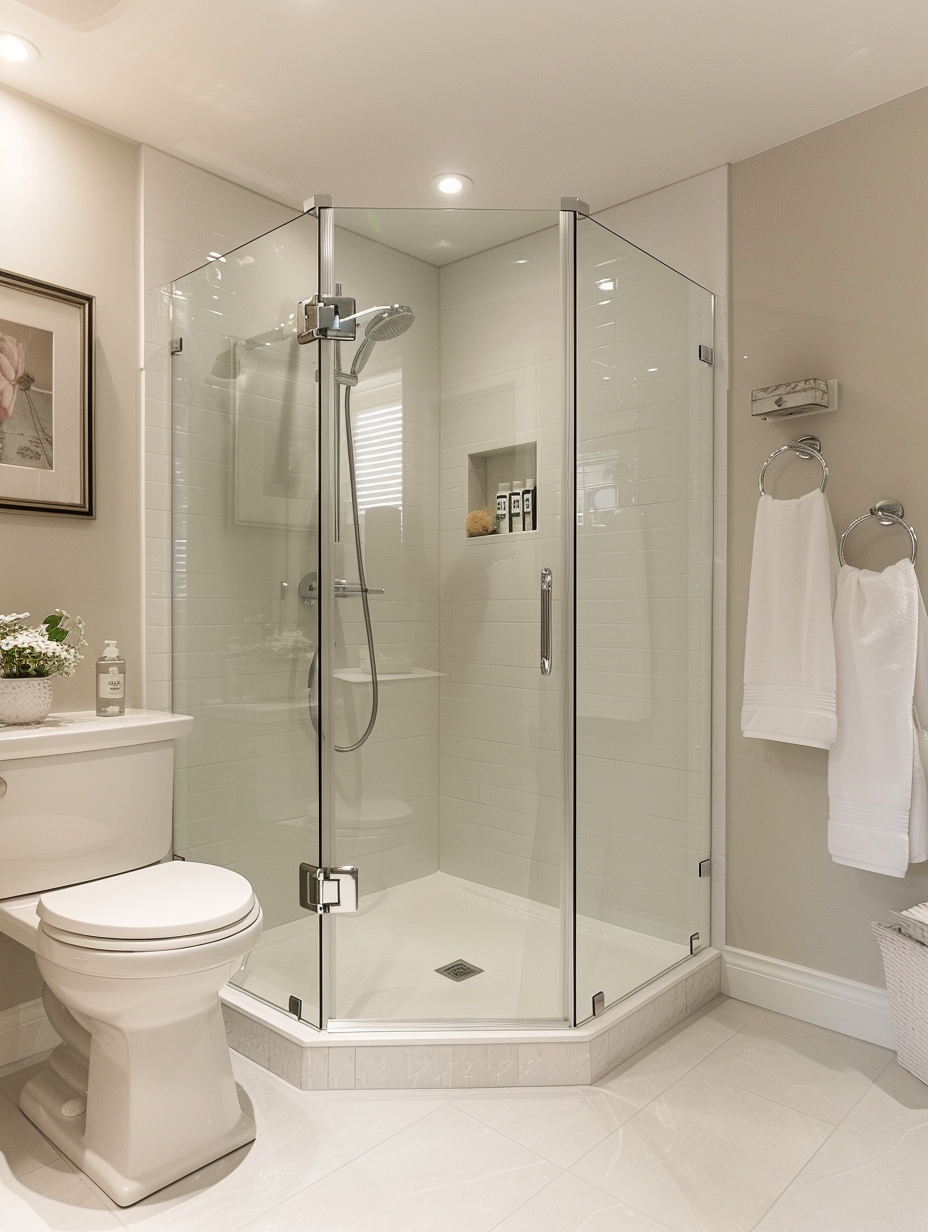 Corner showers are great for saving space in small bathrooms. These designs fit firmly into a corner, giving more space on the floor and, at the same time, providing a cozy shower area. Use a sleek glass enclosure and some sneaky storage solutions to get the most out of the cramped bathroom space.
