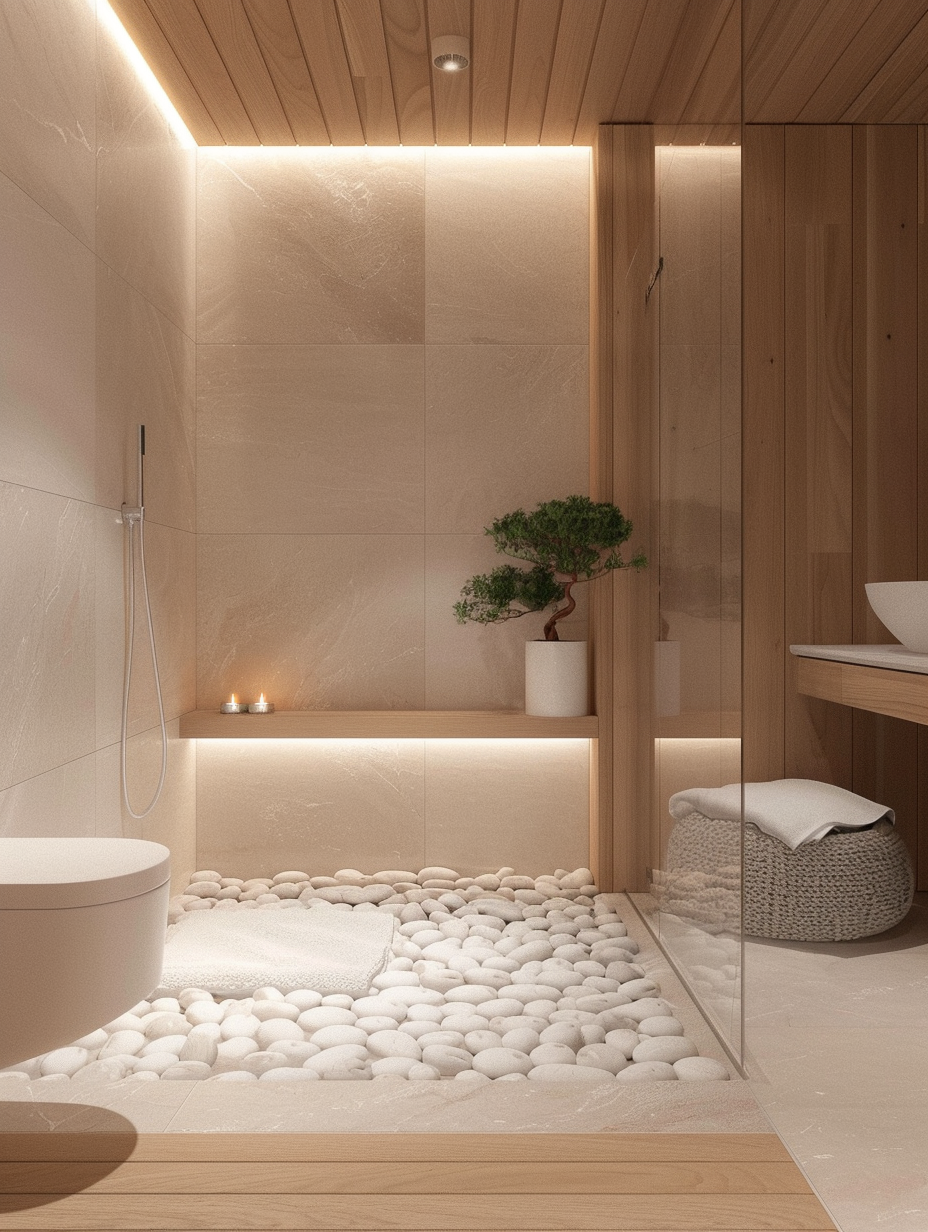 Nature-based shower concepts take a hint of outdoor design for calming and healing space. Use the existing natural materials including wood, stone, and pebbles, and introduce a plant or two for a green touch. These designs make space calm and harmonious with nature.