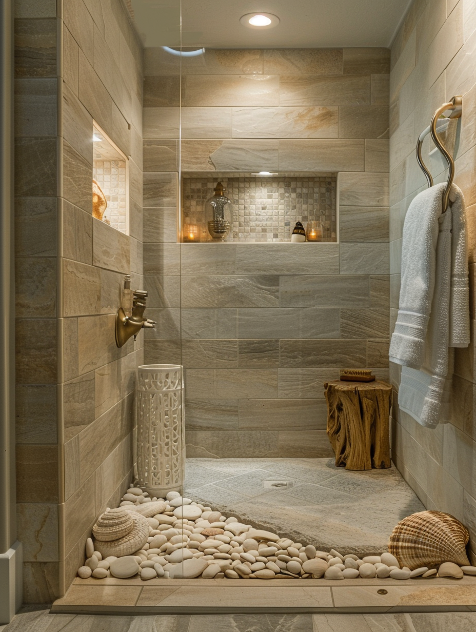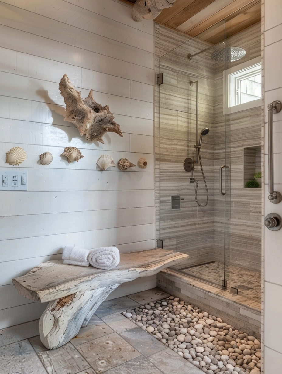Coastal showers inspired by the beach will bring a relaxed, vacation-like ambiance to your bathroom. Utulize cool, sandy tones, sea-themed tiles as well as eco materials like driftwood and seashells. Include details of pebble flooring, nautical accessories, and big windows to perfect the beach ambience and achieve the tranquility of a spa-like environment.