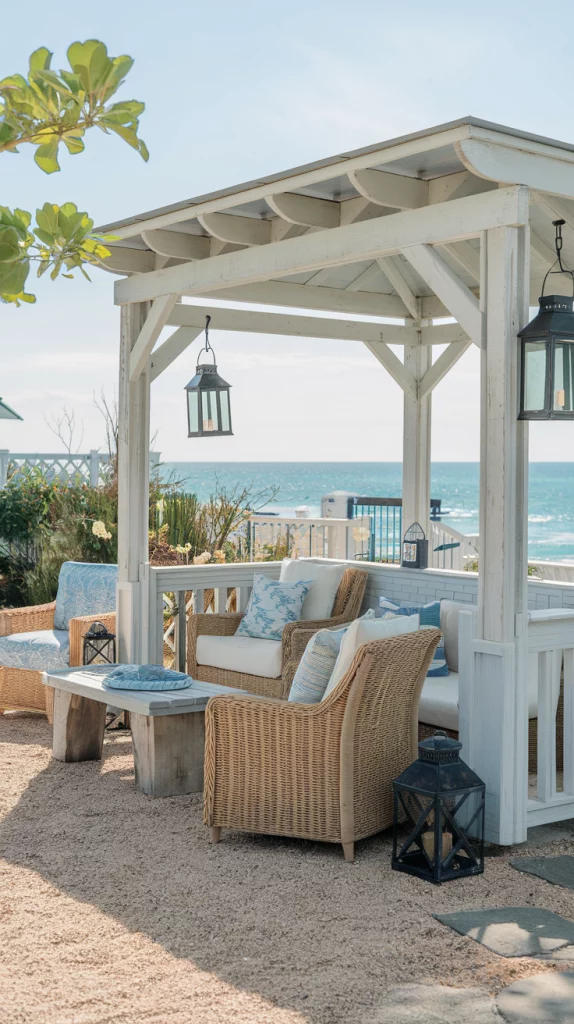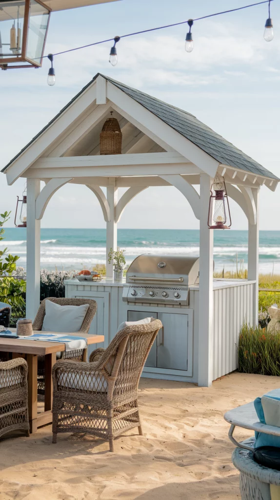 Beach-style BBQ shelters bring a relaxed and breezy vibe to coastal homes. Using materials like whitewashed wood, wicker furniture, and light fabrics, these shelters create a casual yet stylish outdoor retreat. Add nautical-themed decor and lanterns to complete the coastal look, making it perfect for seaside gatherings.