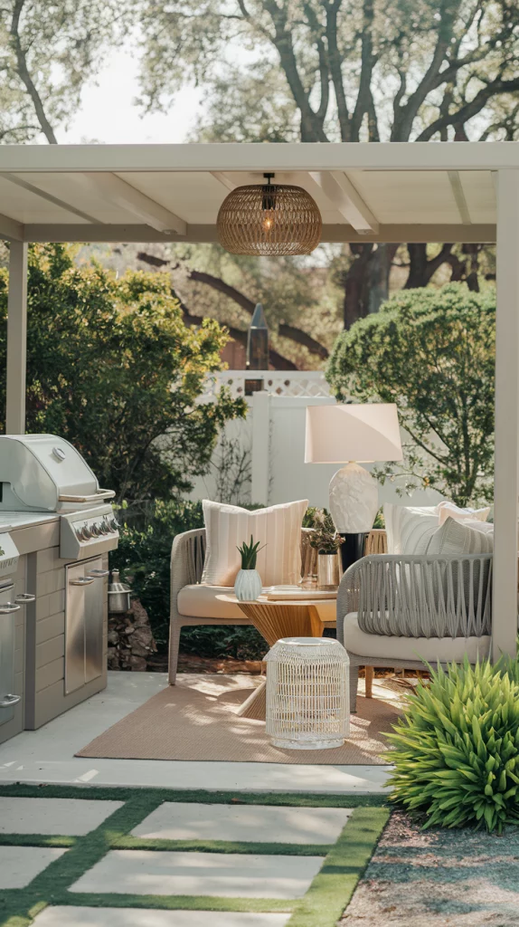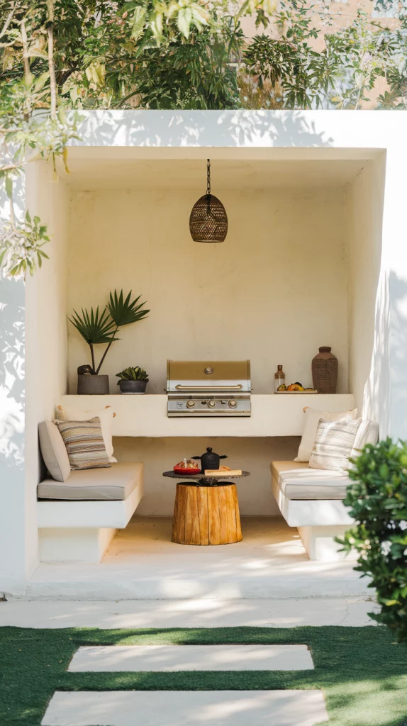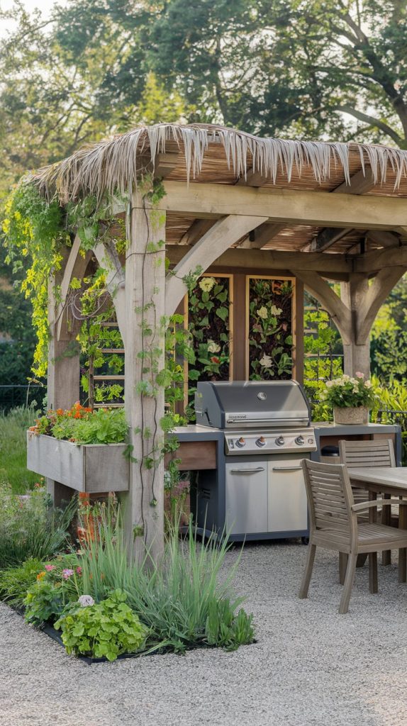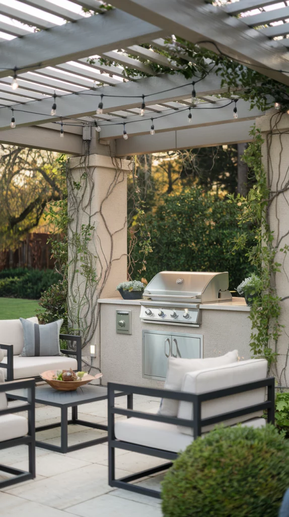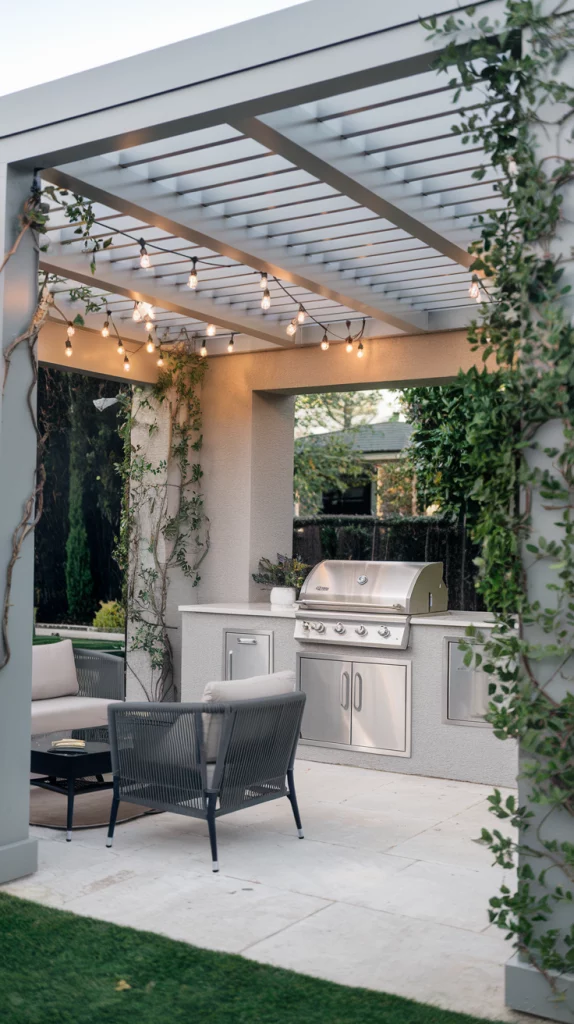 Pergola-style BBQ shelters bring an air of elegance to outdoor spaces. With open slatted roofs and climbing plants, they create a beautiful natural canopy. Add decorative string lights, modern furniture, and lush greenery to enhance the sophisticated atmosphere.