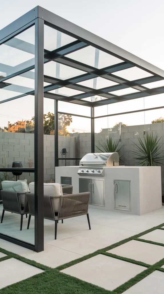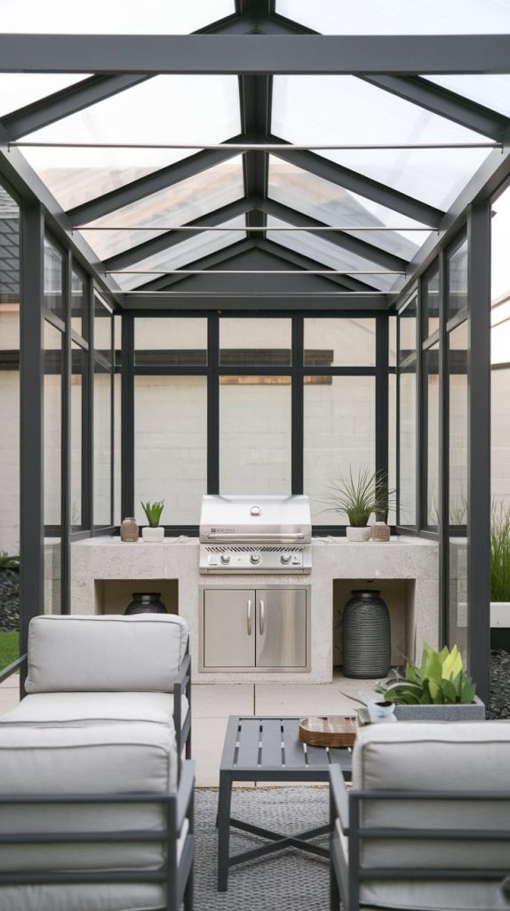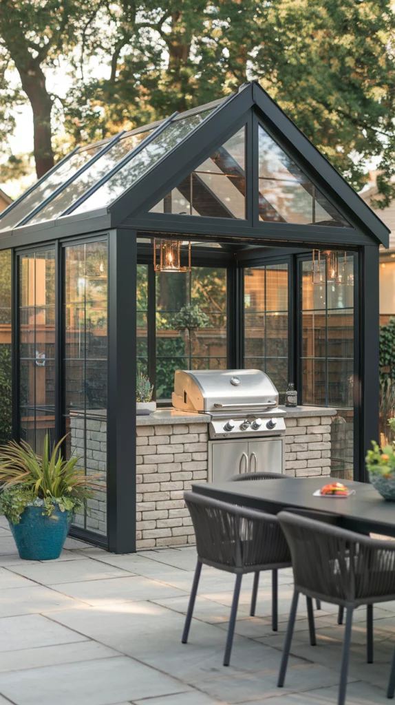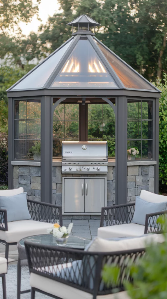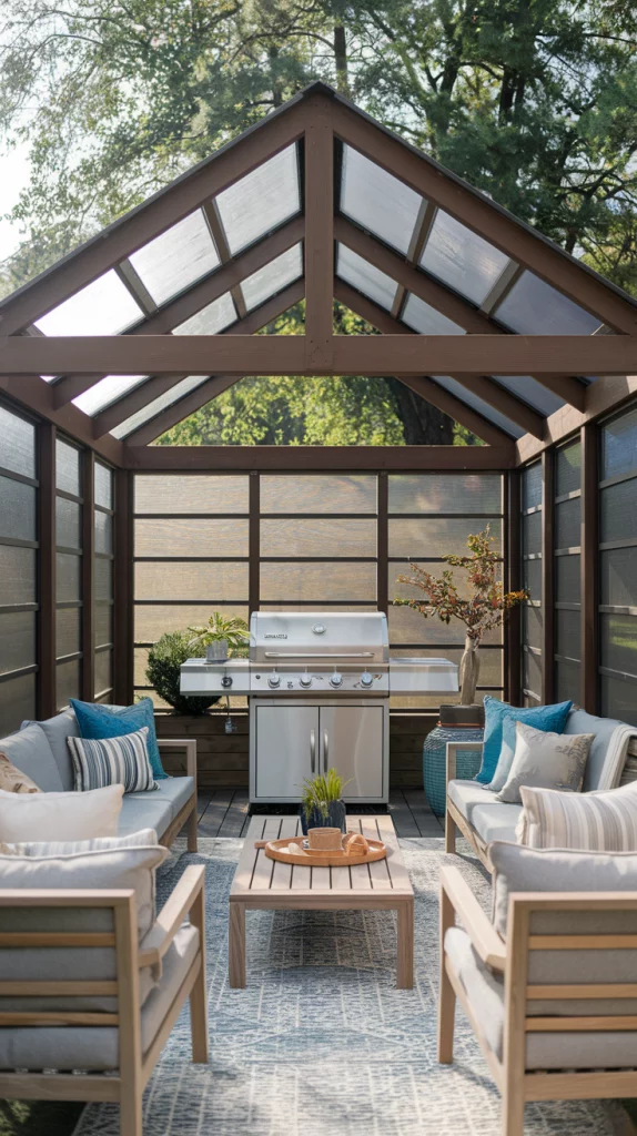 A BBQ shelter with modern glass roofing combines elegance with functionality. The transparent roof allows natural light to flood the area while providing protection from the elements. Pair with sleek materials like steel or aluminum for a contemporary look, and add LED lighting for a seamless transition from day to night.