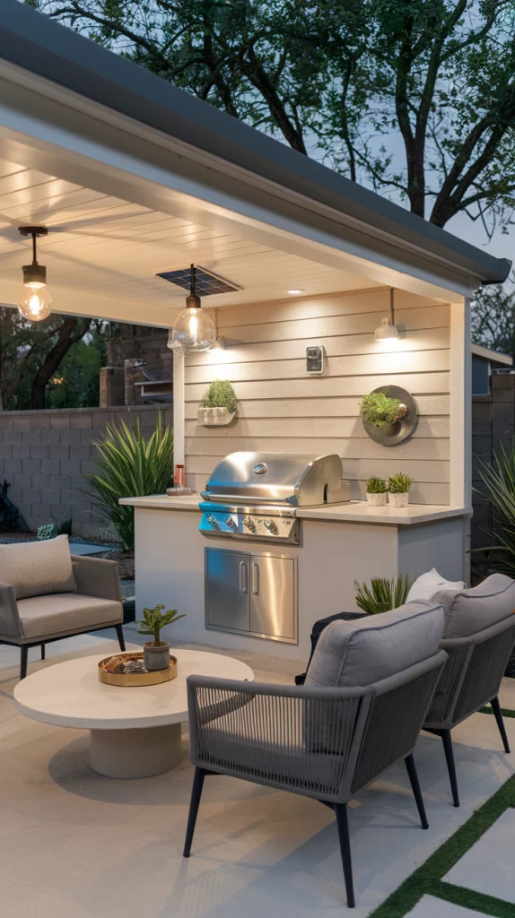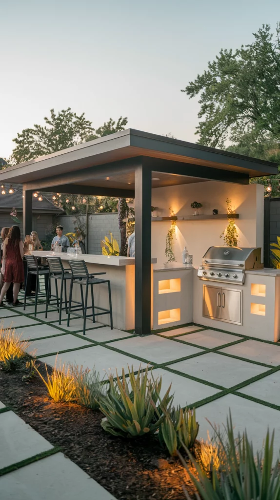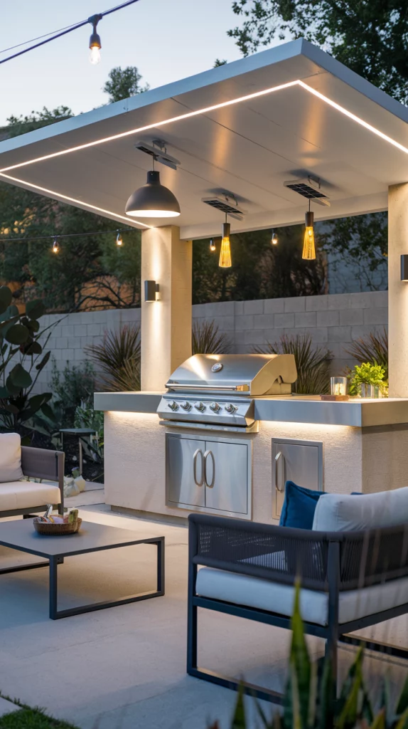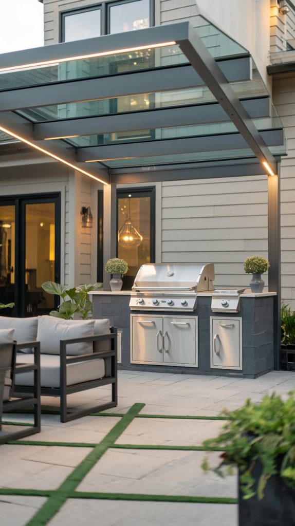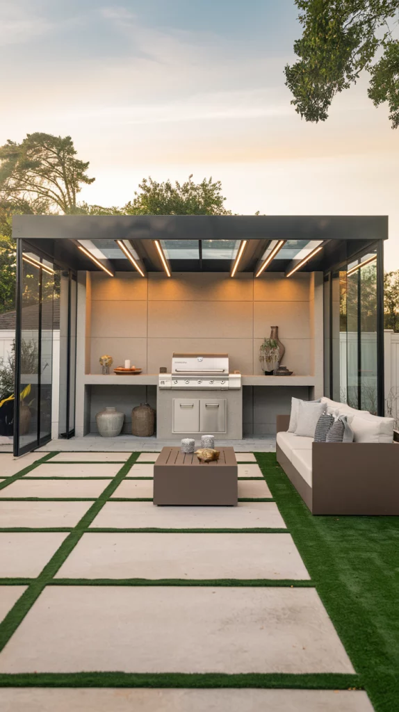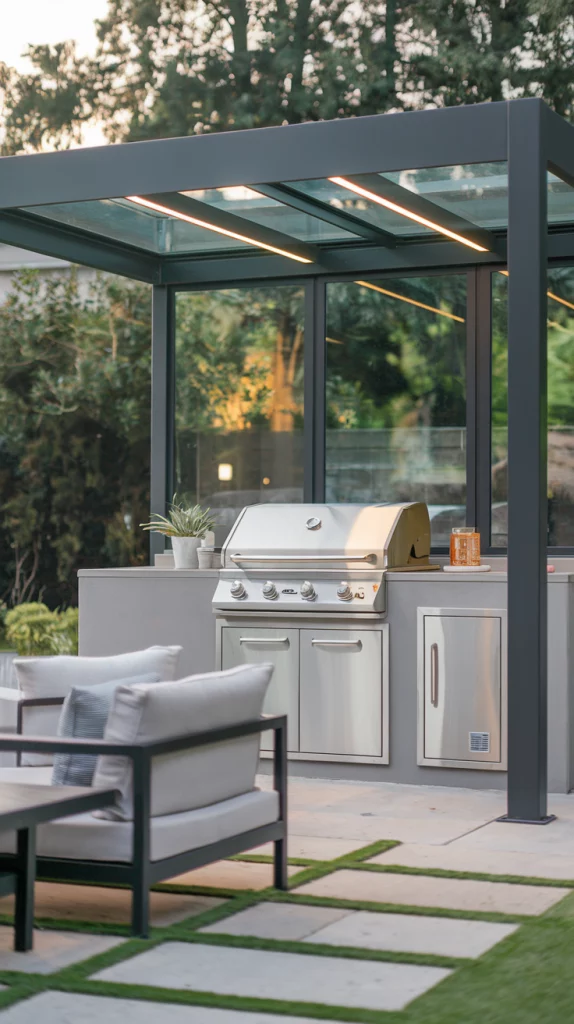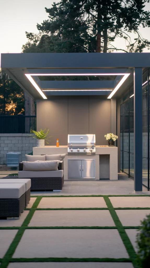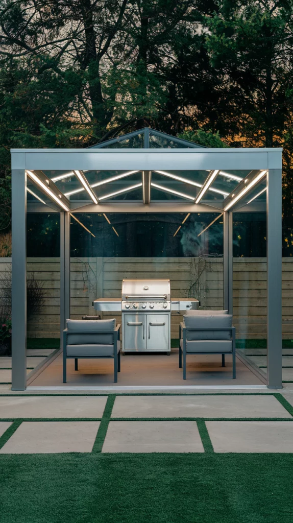 Modern BBQ shelters stand out with clean lines, sleek materials, and LED lighting for a sophisticated touch. These shelters often feature glass or metal accents and smart lighting solutions that enhance evening cookouts. Pair with modular furniture and a high-tech grill for a cutting-edge outdoor setup.